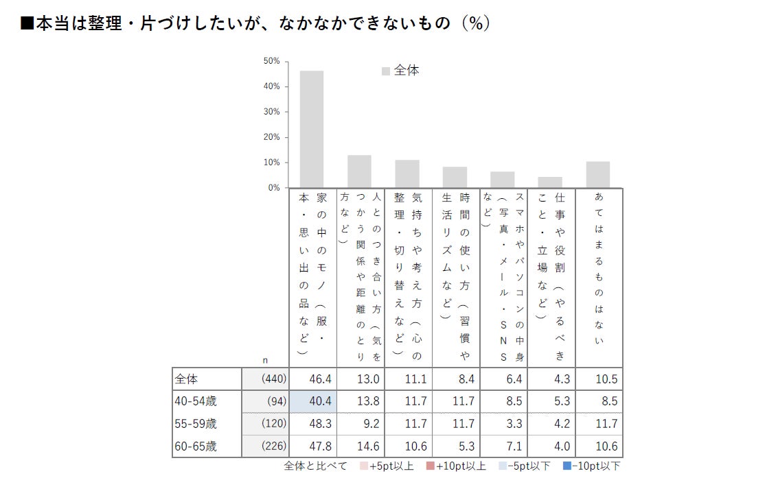 本当は整理・片づけしたいがなかなかできないものとして、1位に「家の中のモノ(服・本・思い出の品など)(46.4%)」、2位に「人とのつき合い方(13.0%)」がランクイン。モノだけでなく人間関係の整理を意識する層も一定数見られる。