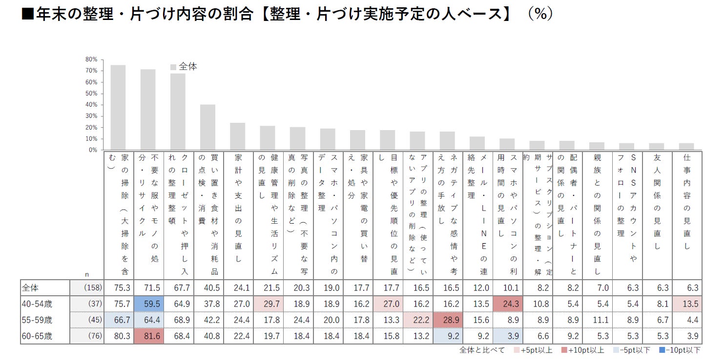 最も多いのは「家の掃除(大掃除を含む)(75.3%)」。「不要な服やモノの処分・リサイクル」については、60-65歳(81.6%)で高く、40-54歳(59.5%)は低め。