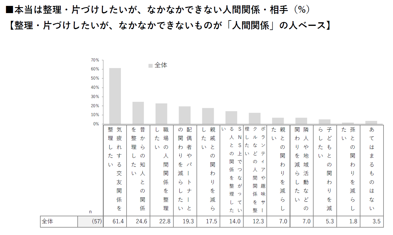 「整理・片づけしたいが、なかなかできない人間関係・相手」の最多は「気疲れする交友関係(61.4%)」。次いで、「昔からの知人(24.6%)」「職場の人間関係(22.8%)」「配偶者やパートナー(19.3%)」などが挙げられた。