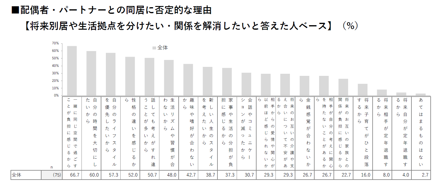その理由として「一緒に同じ空間で過ごすことが負担(66.7%)」「自分の時間を大切にしたい(60.0%)」「自分のライフスタイルを優先したいから(57.3%)」などが挙げられた。
