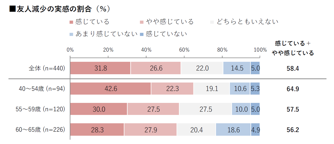 40-65歳女性の58.4%が、友人の減少を実感していると回答。特に40-54歳では64.9%と若年層ほど減少を実感している。