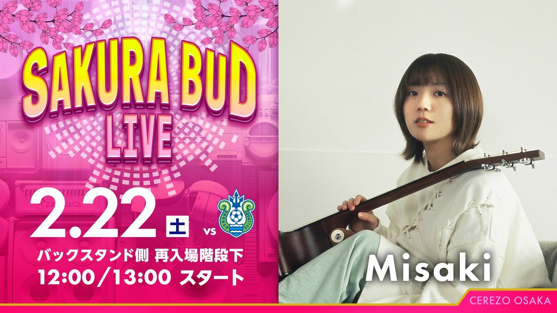 2025シーズンより、ホームゲームのスタジアム場外に新たなエンターテインメントとして「SAKURA BUD LIVE」を開催いたします。「SAKURA BUD LIVE」は、関西圏を中心に活躍するミュージシャンが弾き語りなどのパフォーマンスを披露するライブイベントです。名前の「BUD」には、英語で“蕾”という意味があり、未来の活躍が期待されるアーティストが情熱あふれるステージをお届けします。ホーム開幕戦の2/22(土)湘南戦では、シンガーソングライターのMisakiさんにパフォーマンスいただきます。試合前のひとときを、音楽とともにお楽しみください!