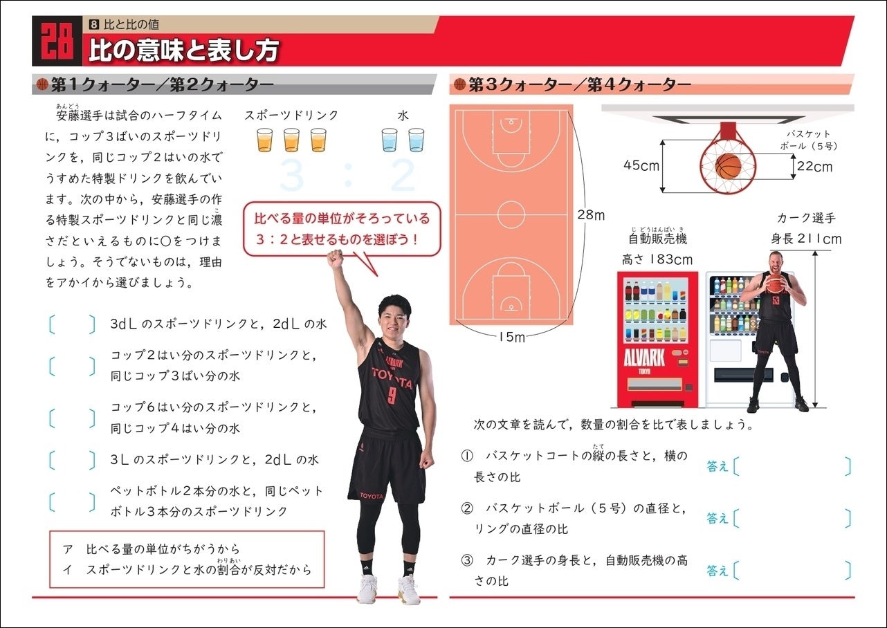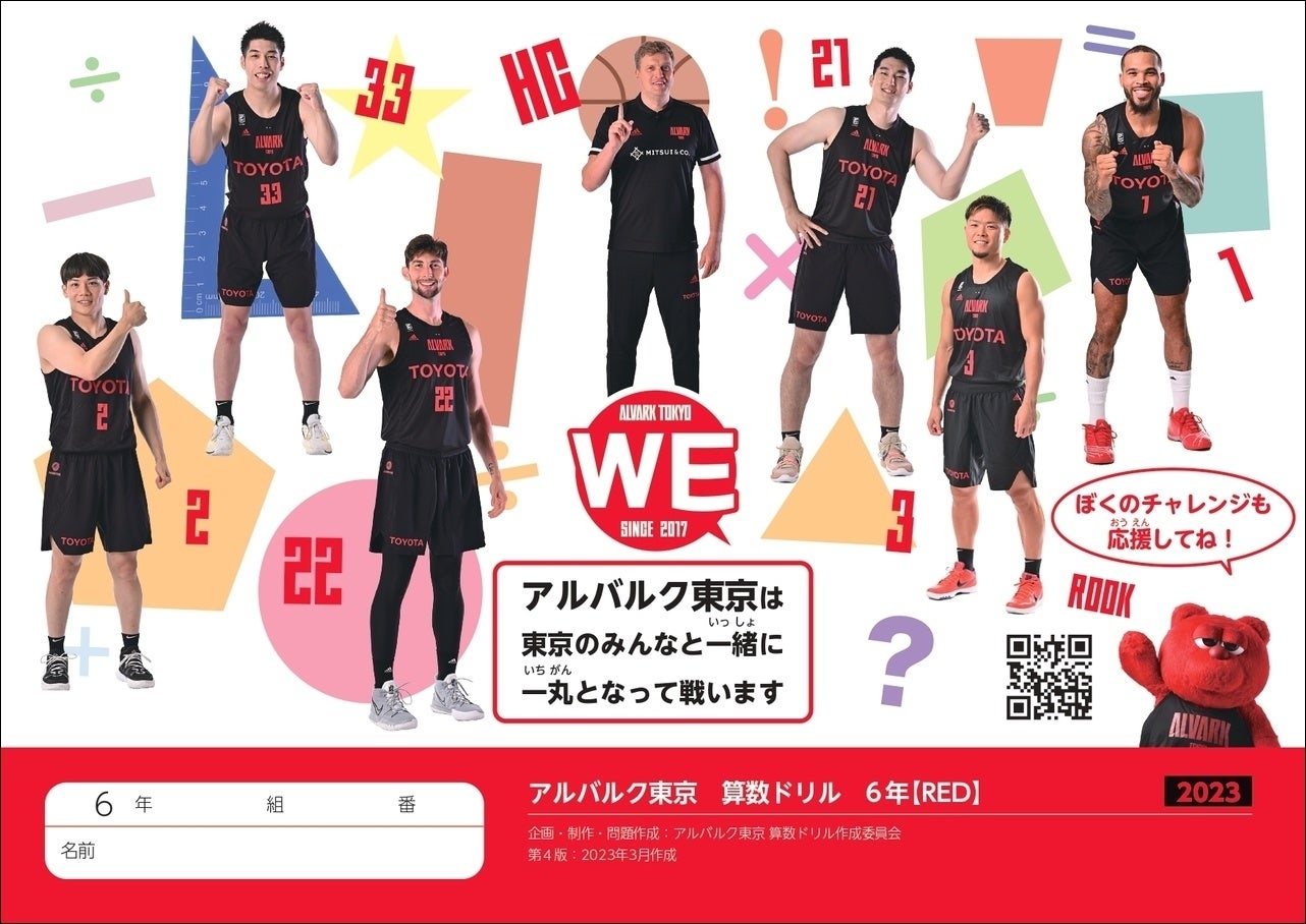 この度、バスケットボールおよび当クラブを題材とした小学校 6 年生向けの教材「アルバルク東京算数ドリル(2023年度版)RED」が完成しました。