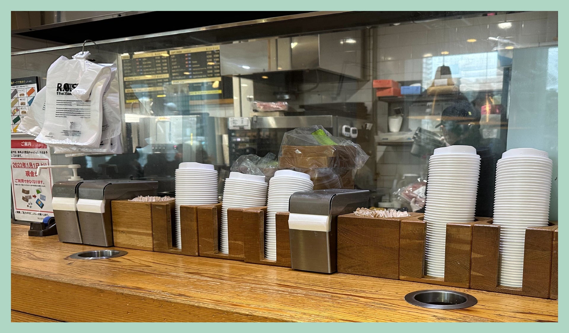 レジでお渡しするドリンクは全て専用紙コップでご提供し、蓋やマドラーはレジ横の専用スペースからお客様ご自身でお持ち帰りいいただいています。