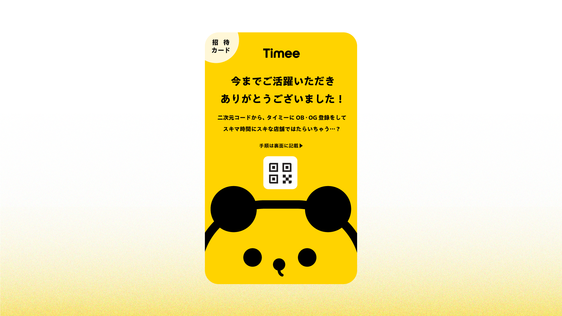 退職者に、「タイミー」でまた働けるOB・OGに招待する専用カードを配布。カードに記載された手順が完了すると、ブランドの OB・OGグループに追加されます。「タイミー」をこれまで使ったことがない人も、カードの招待を通じてOB・OGの一員になることができます。