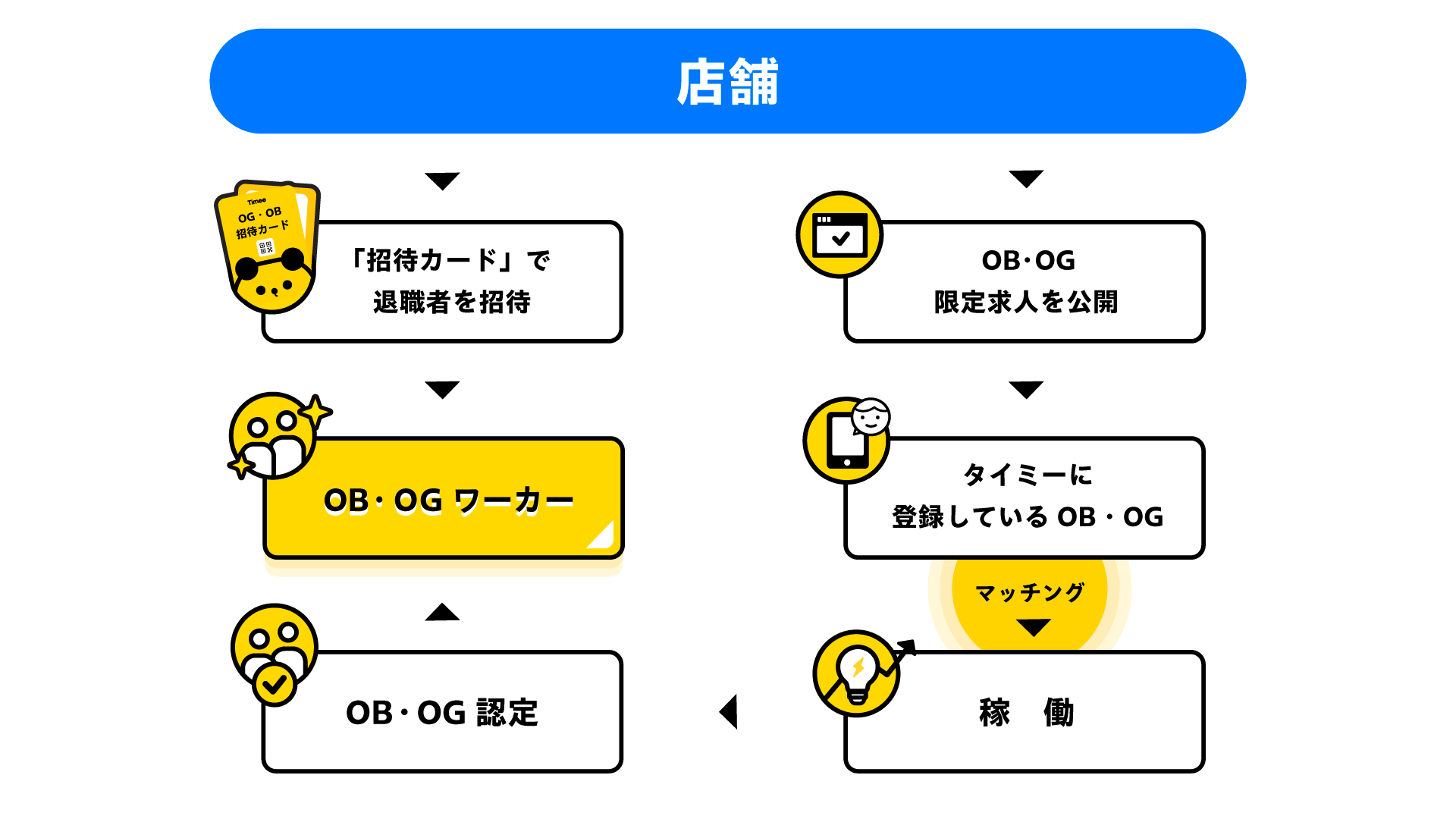 これまで「タイミー」では、「初めて働く人」が安心して働ける仕事と「何回か勤務した人(リピーター)」に向けた仕事など、業務を細かく切り出すことで、あらゆる業種・業界でスポットワーカーの活躍を実現してきました。今回の「アルムナイ機能」の実装で該当ブランドでの勤務経験があるOB・OGが加わることで、より熟練度の高い業務・ポジションを、教育コストをかけずにスポットワーカーに任せられるようになります。働き手は、スキルや経験を活かして再び活躍でき、その働きぶりが評価されることで、働きがいを感じたり、事業者への貢献を実感できたりします。