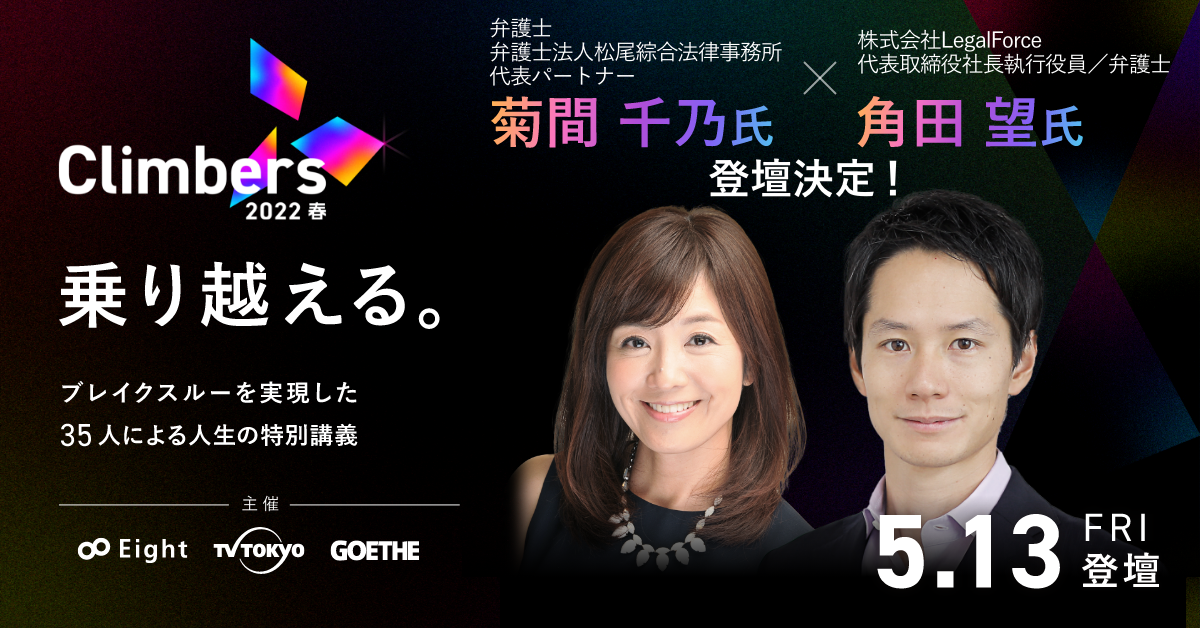AI契約審査プラットフォーム「LegalForce」、AI契約管理システム「LegalForceキャビネ」を提供する株式会社LegalForce(本社:東京都江東区 代表取締役社長:角田望、以下LegalForce)は、Eight(Sansan株式会社)・株式会社テレビ東京 ・GOETHE(株式会社幻冬舎)が主催する「Climbers 2022 - 春 -」に協賛します。5月13日 (金)14時30分頃から、LegalForce代表取締役社長 角田が登壇します。