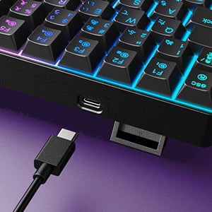 最も小型な60%サイズキーボードに1列分のキーを追加することで、コンパクトさを保ちつつ圧倒的に利便性が向上します。1680万色のRGBライトを搭載し23種類のライト効果を設定しました。F1~F5はカスタマイズが可能でライトの明るさや点滅の速度を調節できます。光を透過するキーキャップの文字は手元をよりきらびやかに演出します。