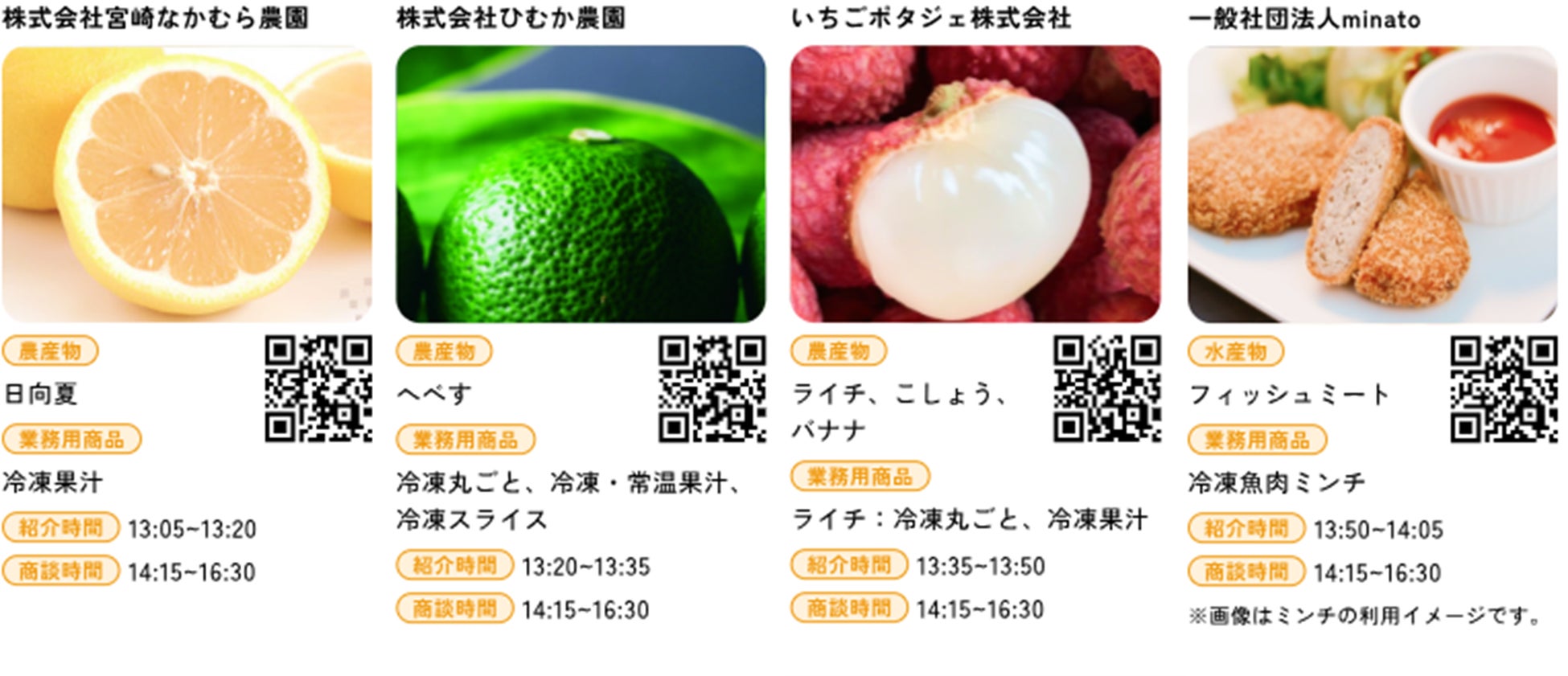 自然豊かで温暖な気候の「日本のひなた宮崎県」で育まれた宮崎特産の「日向夏」や香酸柑橘「へべす」に加え、希少な「国産ライチ」や、胡椒、バナナなど、国産では珍しい農産物もご用意し、生産者である農業法人等より直接それらの商品の魅力についてご説明させていただきます。この機会に、情報収集や意見交換のためにぜひお気軽にご参加ください。