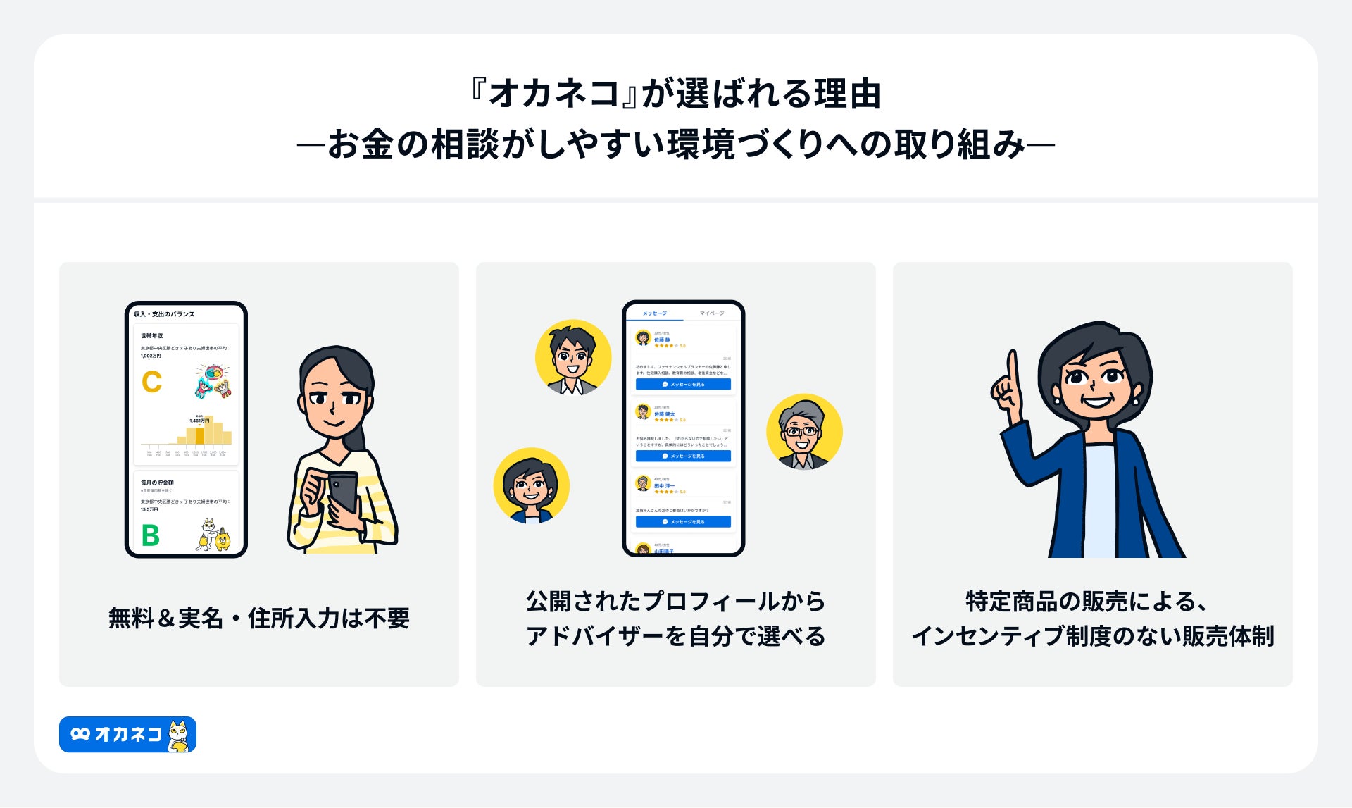 また、オカネコに所属する金融オンライン・アドバイザーは、「お客様本位の接客」をモットーとし、成約に応じたインセンティブ制度のない体制を採用しています。そのため、特定の商品のみを提案することなく、常にユーザーの立場に立ったアドバイスを提供することに専念でき、信頼性の高いお金の相談パートナーとして伴走しています。
