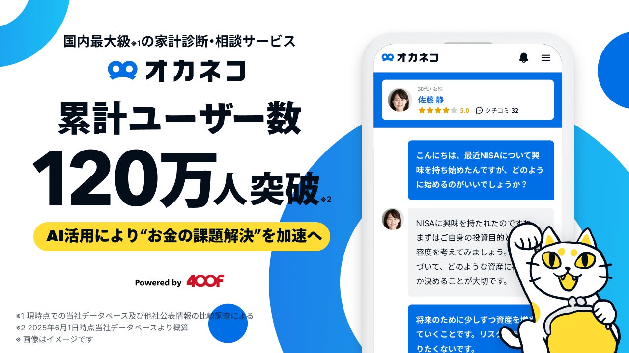 国内最大級(※1)の家計診断・相談サービス『オカネコ』を運営する株式会社400F(フォーハンドレッド・エフ、本社:東京都中央区、代表取締役社長CEO:中村 仁、以下「当社」)は、このたび『オカネコ』の累計ユーザー数が120万人を突破(※2)したことをお知らせいたします。