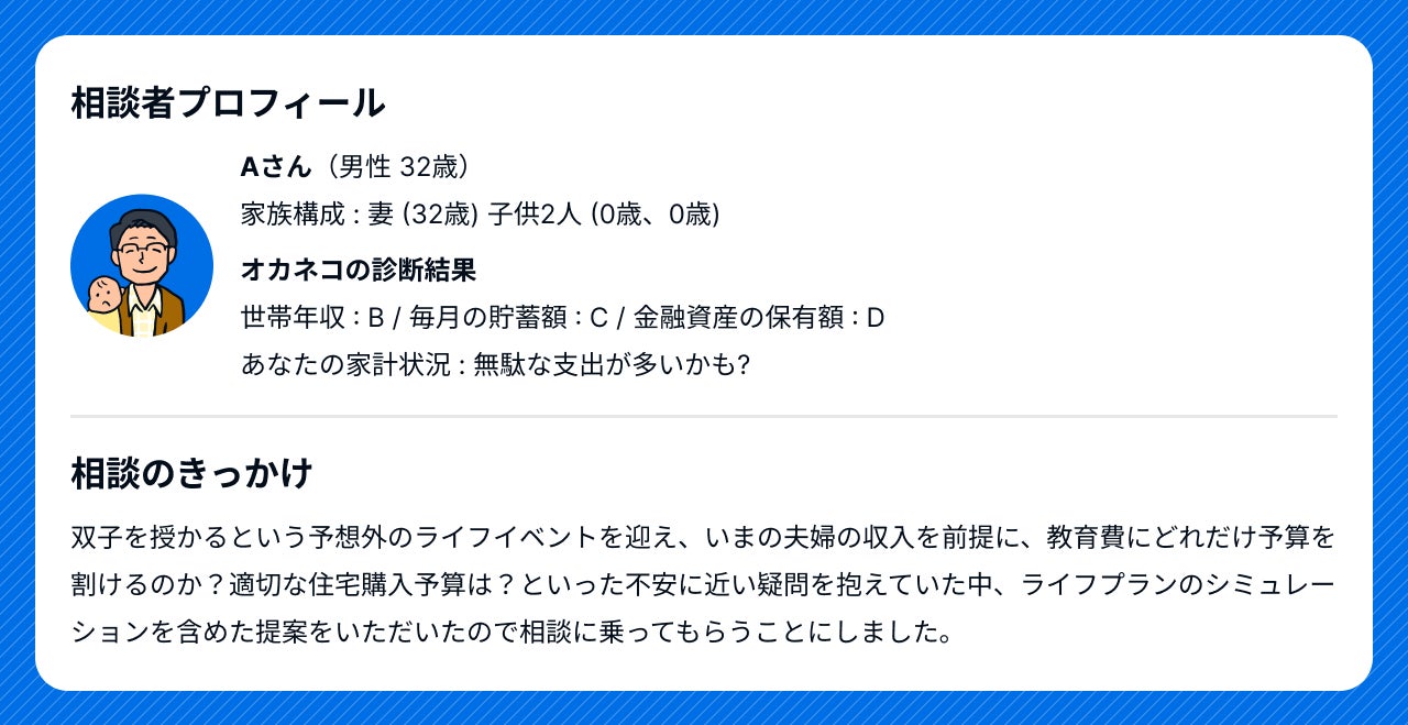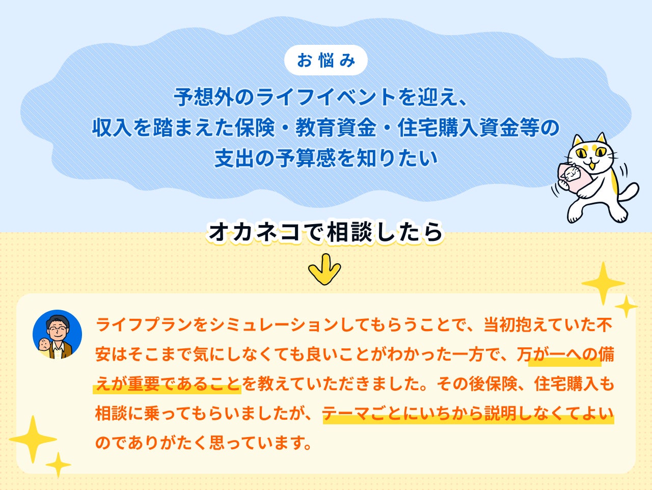 「双子の誕生」という予想外のライフイベントをきっかけに、将来の教育資金や住宅購入、保険の備え方に不安を感じていたAさん。『オカネコ』で初めてライフプランシミュレーションに挑戦する中で、現状に大きな問題はないことがわかり安心された一方、万が一に備える保険が不足している点にも気づかれたそうです。金融オンライン・アドバイザーからの丁寧な提案により、納得のいく保険選びができ、その後は住宅購入を見据えたプランの見直しなど、継続的に『オカネコ』を活用いただいています。