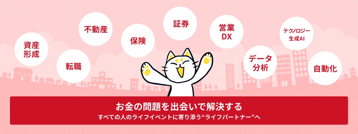 "お金の問題を出会いで解決する"ことを理念に2017年11月に設立。自社でお金のプロ(FP・公的保険アドバイザー等)を抱え、オンライン上で直接ユーザーに金融商品や転職、不動産を仲介するオカネコ事業(ToC)と、大手金融機関や事業会社に対してユーザーとのコミュニケーション最適化を支援するエンタープライズ事業(ToB)を通じて、日本の個人金融資産にアプローチするFinTechスタートアップです。どんな立場の人にも有効な「お金の問題解決」の機会を提供し続けます。