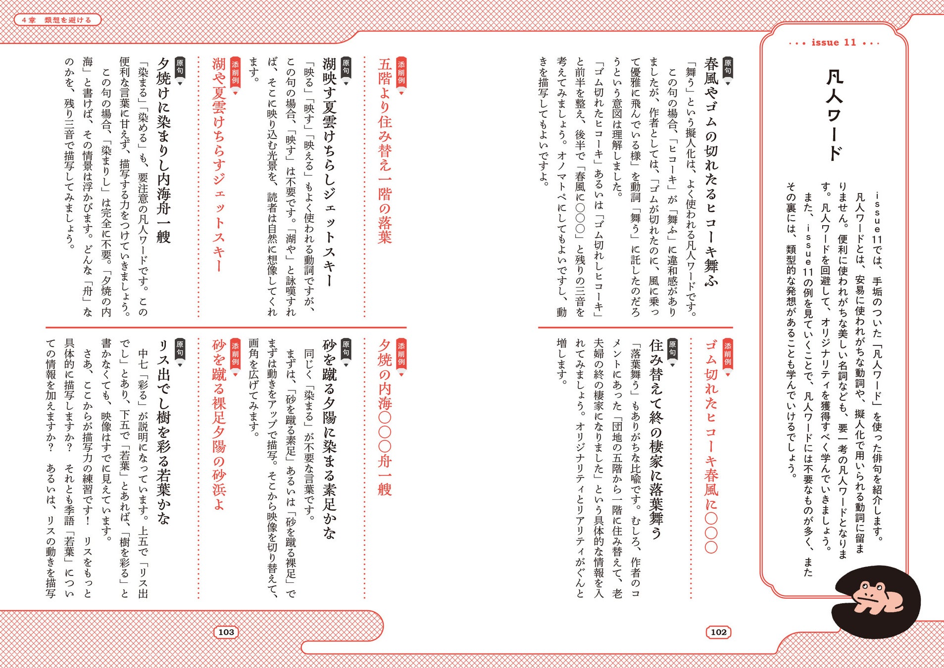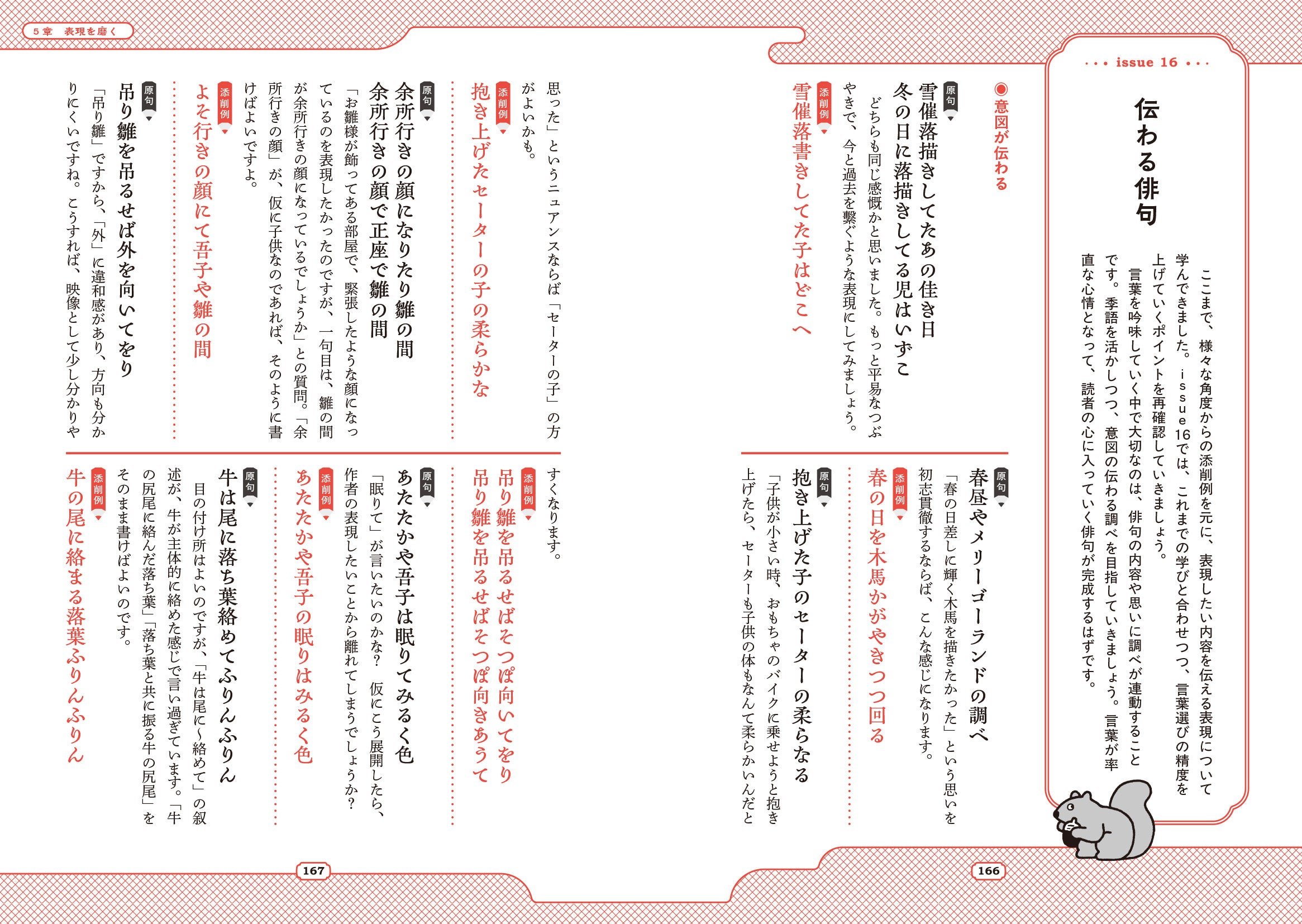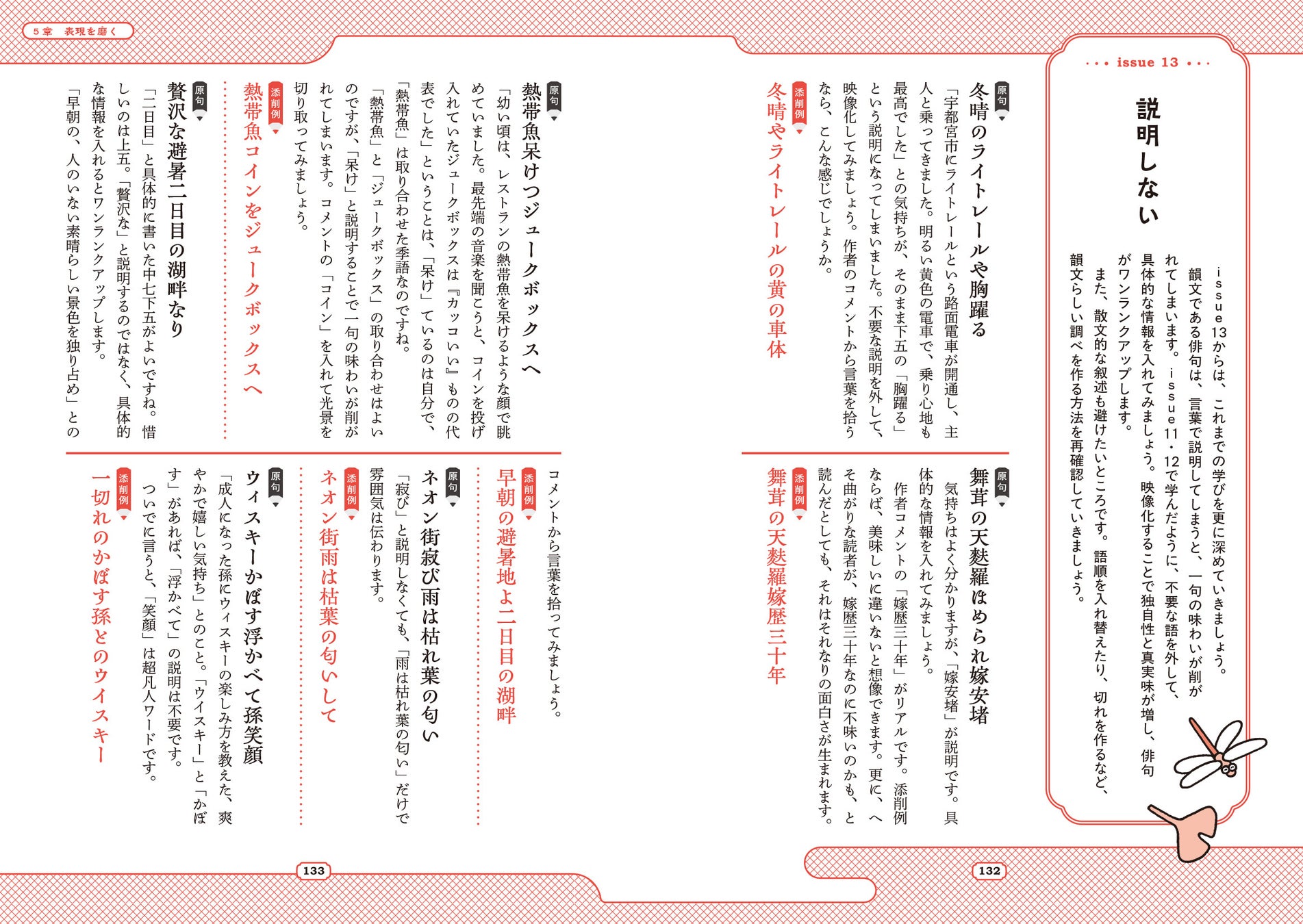 本書では、「季語がない」「字余り・字足らず」「助詞の使い方」「切れ」「凡人ワード」「説明しない」など、俳句で頻出するミスを項目別に整理。