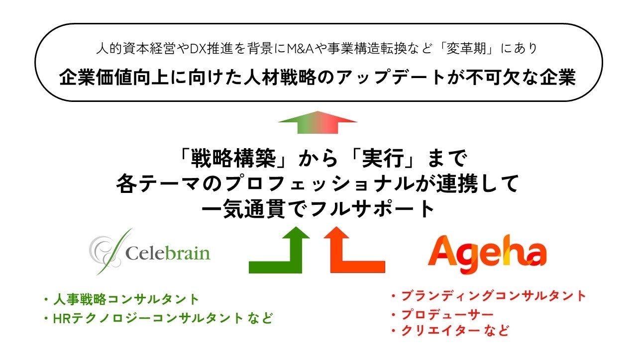 今回の業務提携により、セレブレインの「戦略・制度構築力」と当社の「表現・浸透力」という、明確に棲み分けされた強みを掛け合わせることが可能となります。両社の強みは競合することなく高い相互補完性を発揮するため、顧客企業に対し、戦略の「構築」から「実行・浸透」まで、シームレスかつ一気通貫での変革を伴走支援します。