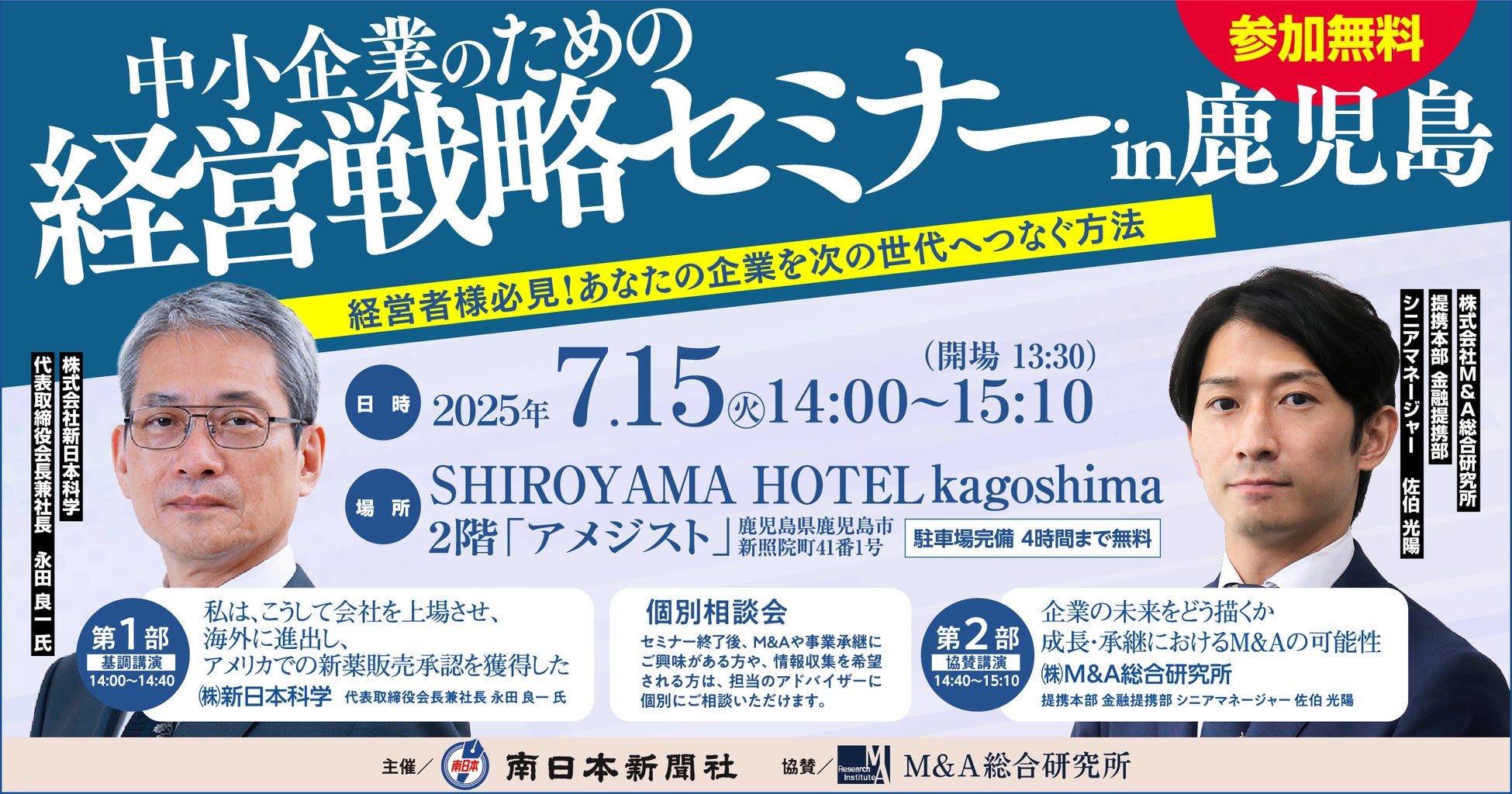 この度、鹿児島県の中小企業の事業承継や成長戦略をテーマに、セミナーを開催することとなりました。第一部は、株式会社新日本科学 代表取締役会長兼社長 永田良一氏より「私は、こうして会社を上場させ、海外に進出し、アメリカでの新薬販売承認を獲得した」と題し、ご講演を頂戴します。第二部は、株式会社M&A総合研究所 提携本部 金融提携部 シニアマネージャー 佐伯光陽より「企業の未来をどう描くか 成長・承継におけるM&Aの可能性」と題してお話しいたします。
