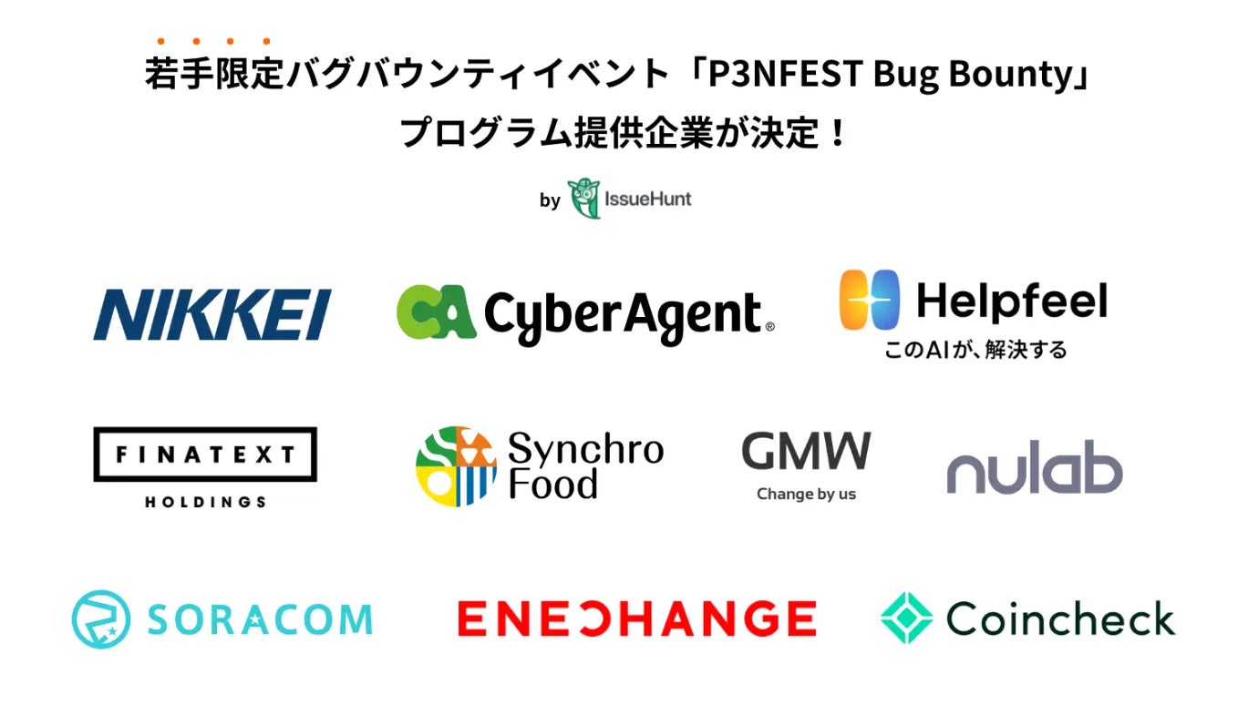 バグバウンティ・プラットフォーム「IssueHunt ( https://issuehunt.jp/ )」や、アプリケーションセキュリティポスチャー管理(ASPM)ツール「Baseline( https://baselinehq.io/ )」を提供するIssueHunt株式会社(本社:東京都中央区日本橋茅場町一丁目8番1号、代表取締役:横溝 一将)は、大学生以上25歳以下限定バグバウンティイベント、「P3NFEST Bug Bounty 2026 Spring」を、2026年2月16日〜3月31日に開催することをお知らせいたします。