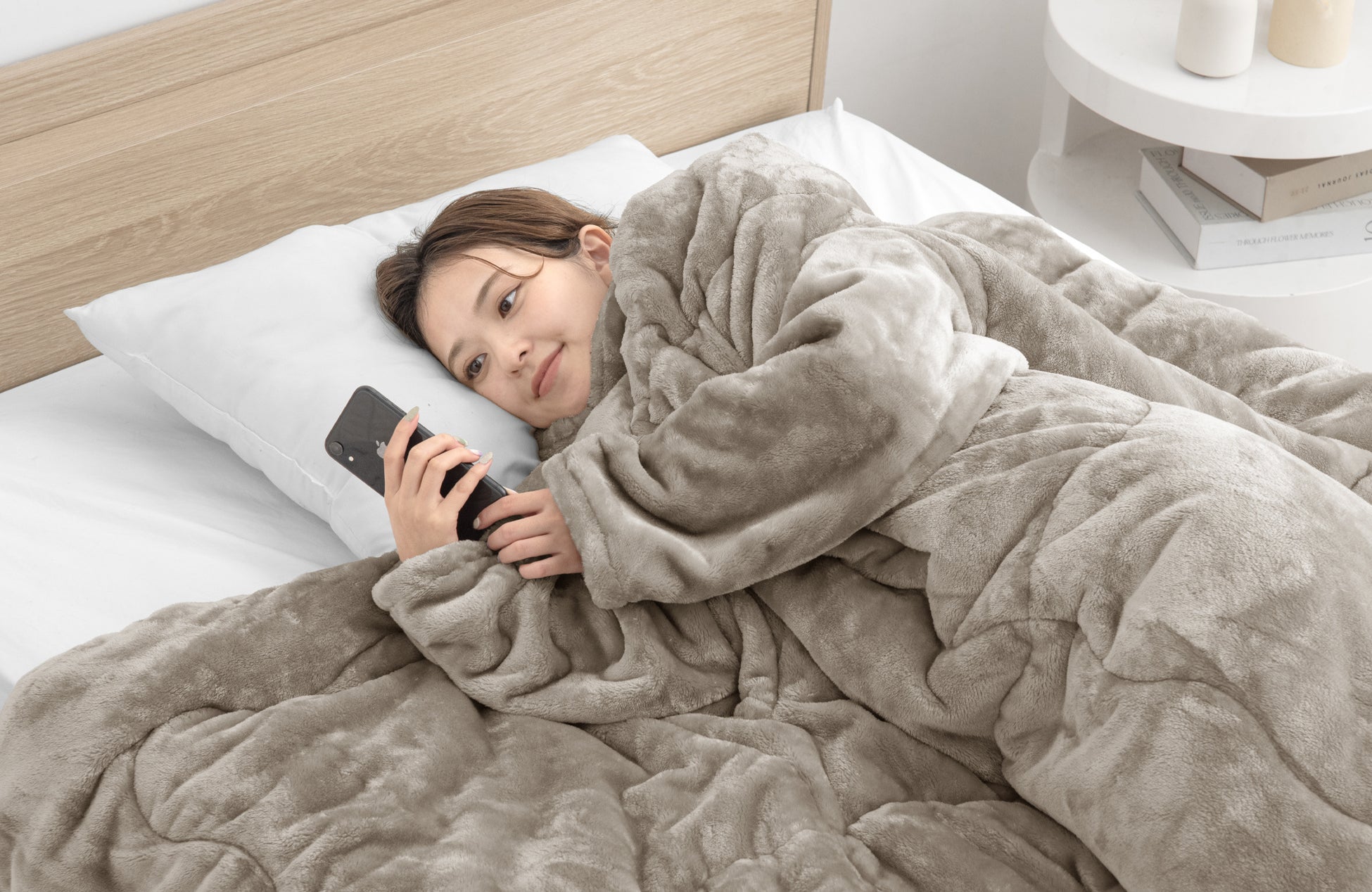 【タンスのゲン】袖が付いたことで、布団に包まれながらスマホ操作が可能になった掛け布団が登場!冷気が入らない構造・断熱素材に加え、とろける肌触りの生地を採用し、暖か快適な夜更かしを