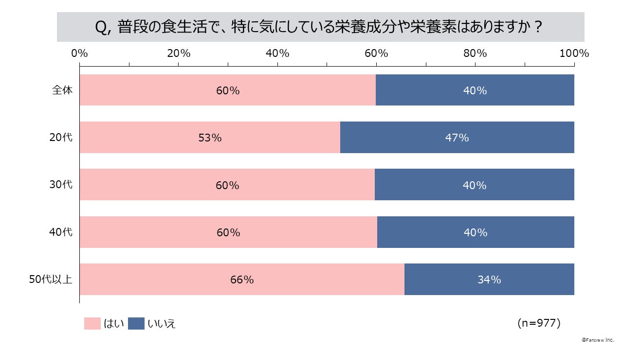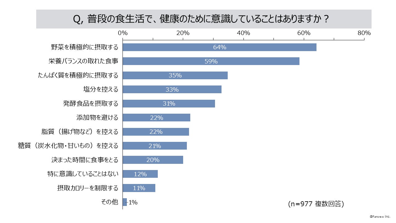 お客さまの声を最先端の分析でファン増加につなげる企業、株式会社ファンくる(本社:東京都千代田区、代表取締役社長:山口敬人)は、「ファンくる」会員を対象に、定期的に消費者の意識調査を実施しています。今回は普段の食生活について、健康のために意識していることや、特に気にしている栄養素などを「ファンくる」会員977名(男性206名、女性771名)に調査を実施しました。