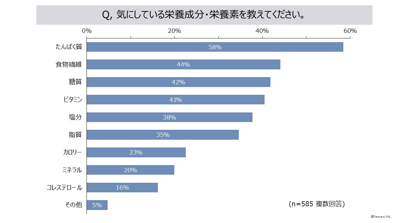 2.普段の食生活で気にしている栄養素は「たんぱく質」58%、「食物繊維」44%