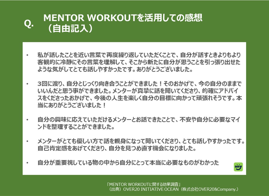 *MENTOR WORKOUTとは、株式会社OVER20&Company.が企業向けに提供する「自律型思考を養成する」マンツーマンセッションであり、2022年6月1日から開始したanyのカリキュラム2でも、同サービスを提供中。