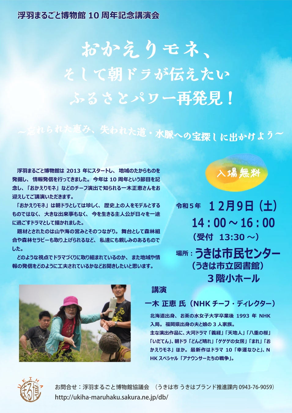 浮羽まるごと博物館は2013年にスタートし、地域のたからものを発掘し、情報発信を行ってきました。今年は10周年という節目を記念し、「おかえりモネ」などのチーフ演出で知られる一木正恵さんをお迎えしてご講演いただきます。