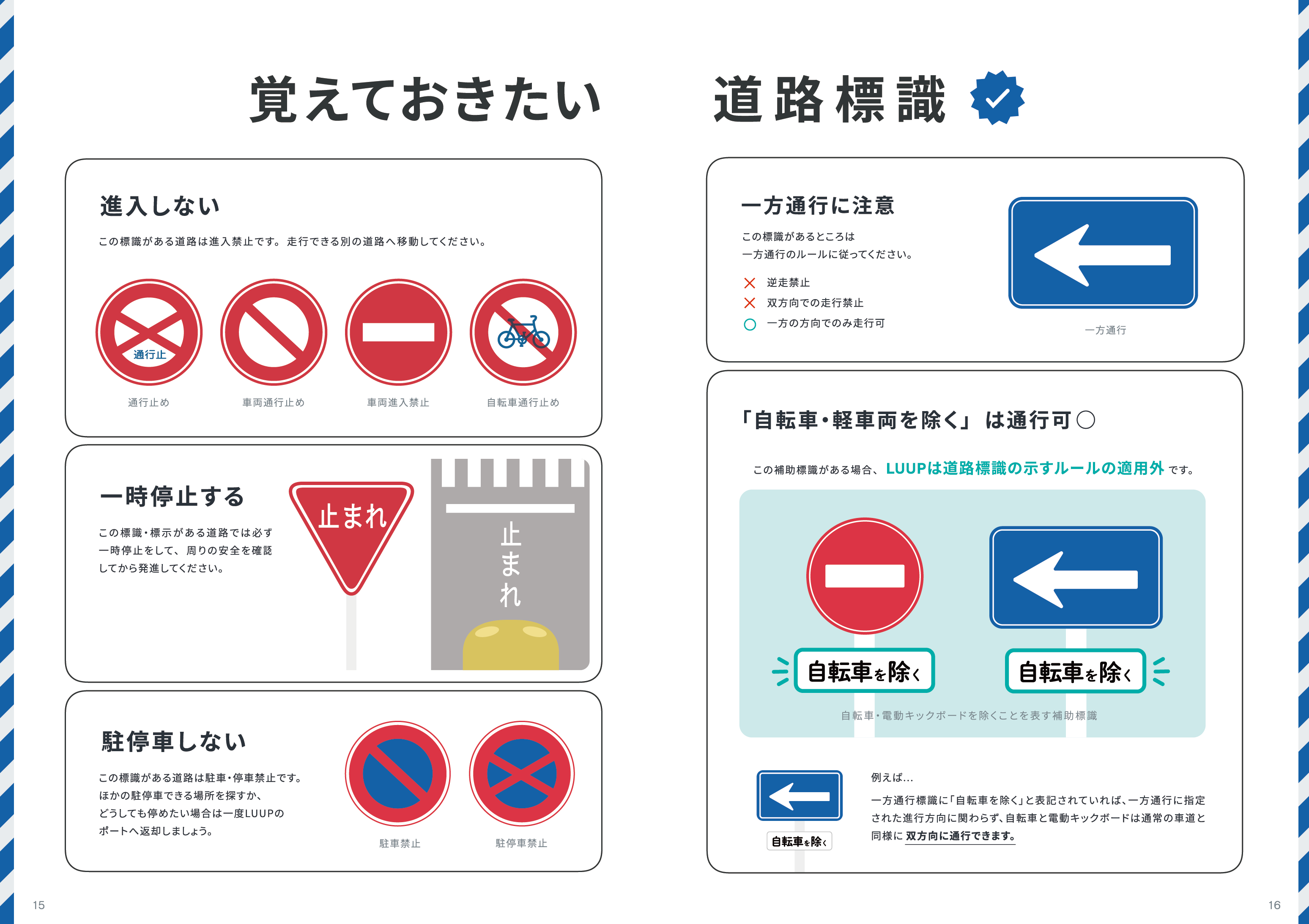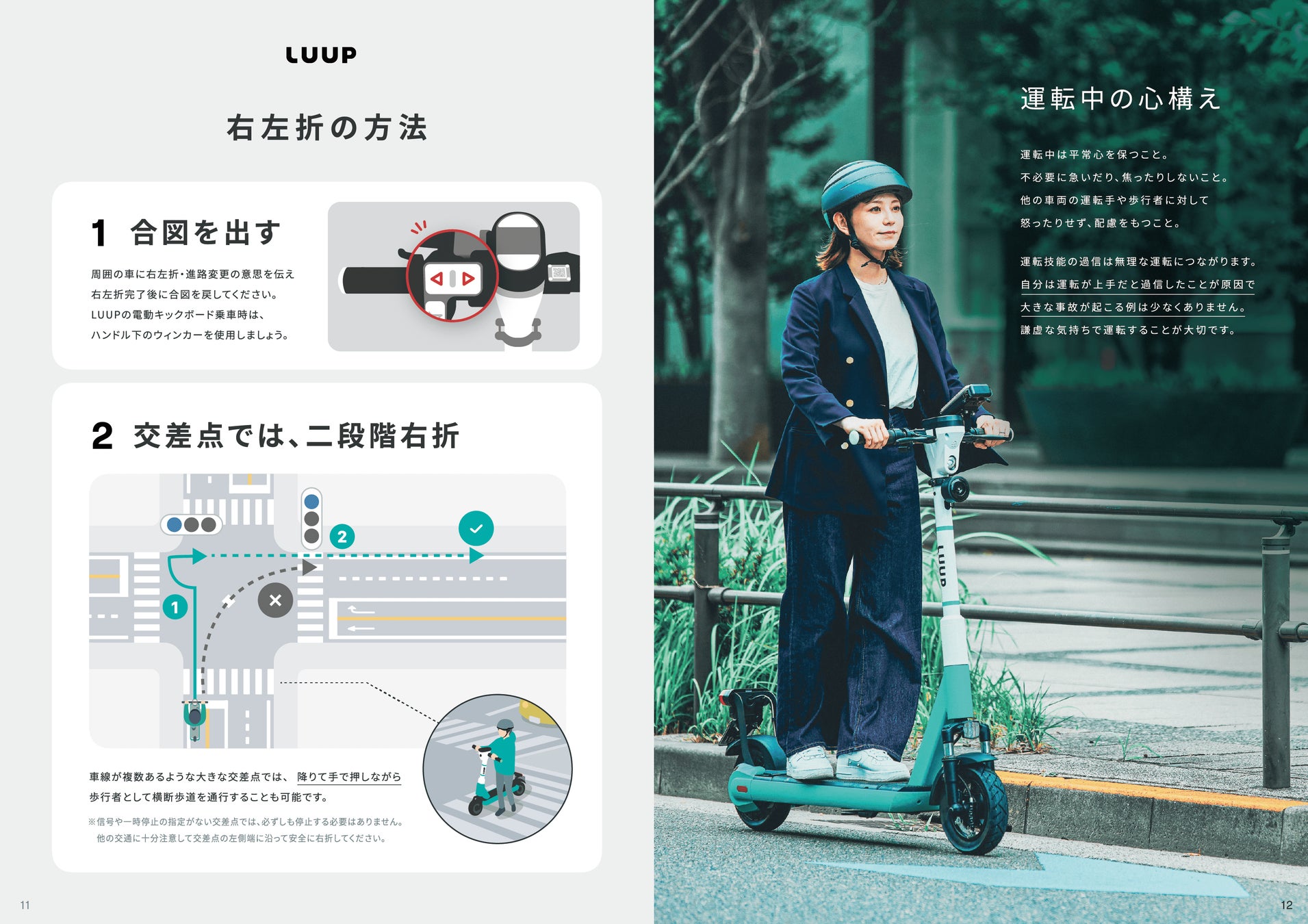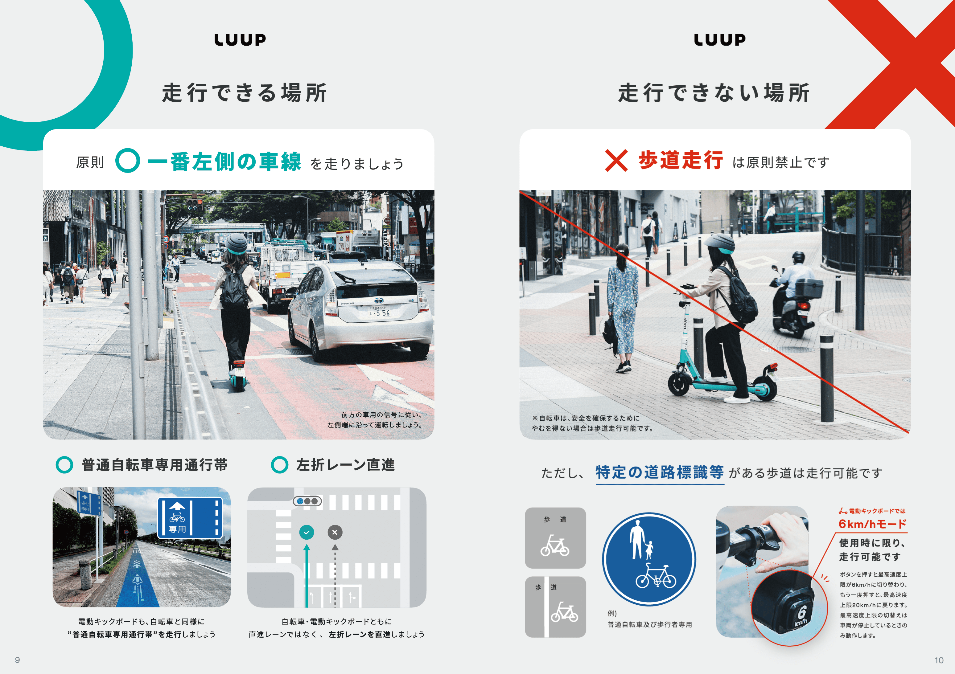 新しいガイドブックでは、LUUPが提供する電動キックボードと電動アシスト自転車の乗り方や、走行できる・できない場所の解説、覚えておくべき道路標識など、初めて電動キックボードに乗る方や、交通ルールをおさらいしたい方向けの情報をわかりやすく整理しています。
