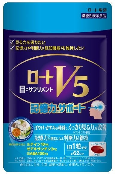 ロート製薬株式会社(本社:大阪市、社長:杉本雅史)は、ものを見る力をサポートする目のサプリメント「ロートV5」シリーズから、くっきり見る力※1の改善だけではなく、加齢に伴い低下する認知機能の一部である「判断力」「記憶力」もサポートする、「ロートV5 記憶力サポート」を2月6日(月)よりロート通販にて発売いたします。