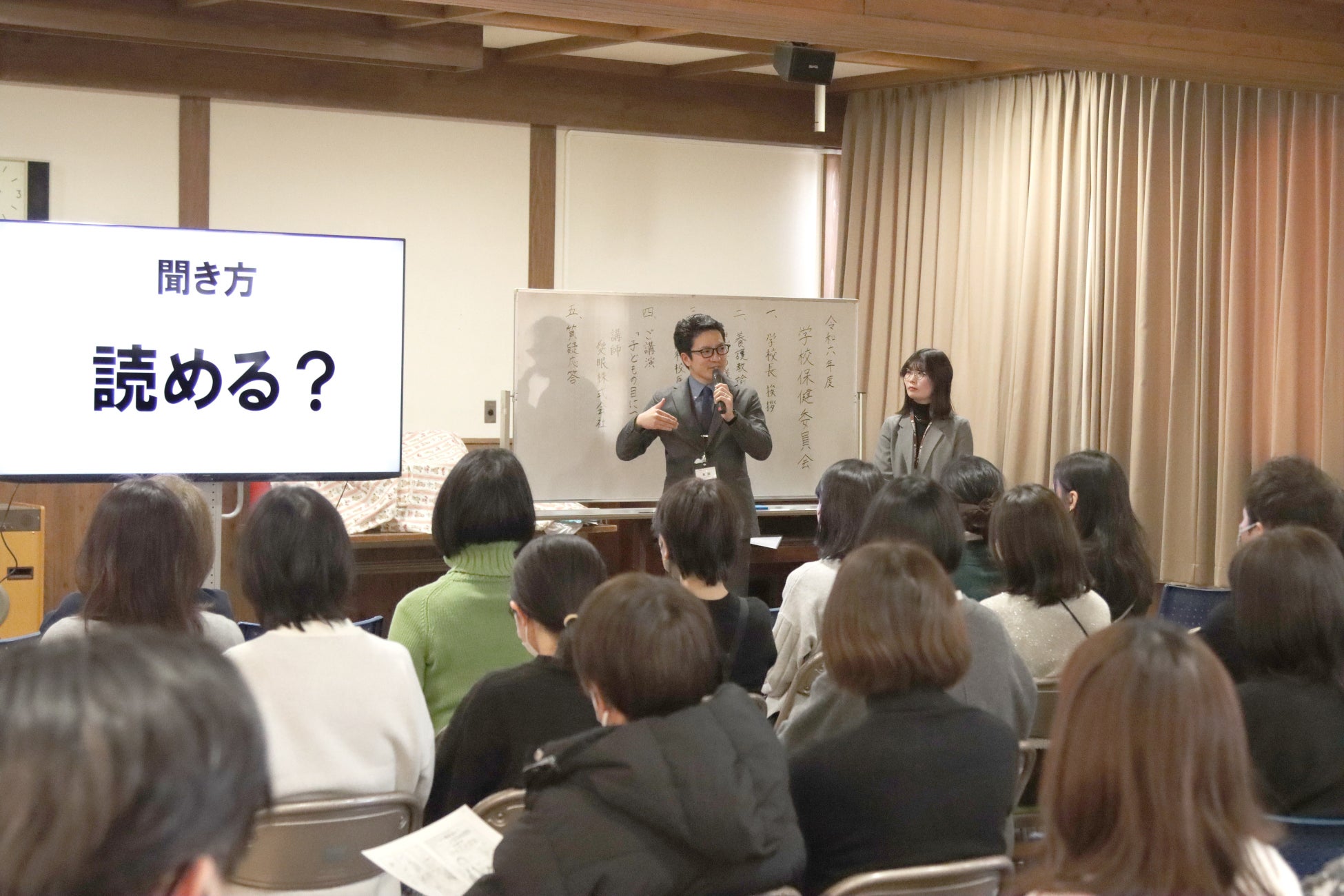 子どもの頃から「眼の大切さ」を理解することは、眼の健康を守ることにつながります。愛眼が出張授業を行うに至った背景として、眼の重要性やメガネの正しい使用法を伝えるために、2023年から小学校への出張授業を始めたことがあります。今回は、この活動をご覧になった学校関係者の方からご連絡をいただき、奈良県内にある小学校で保護者を対象とした出張授業を行いました。平日の午前中に実施された出張授業には、約80名の保護者が集まり、熱心に講義を聞く姿が見受けられました。