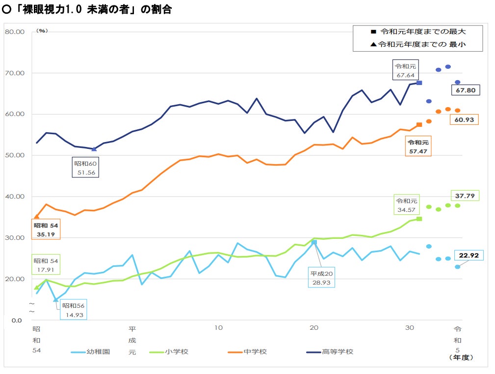 近年、子どもの視力低下が増えており、特に小学生の視力低下が問題視されています。スマートフォンやタブレットの使用がその主な原因とされています。文部科学省が発表した「令和5年度学校保健統計」によると裸眼視力1.0未満の者の割合は、学校段階が進むにつれて高くなっており、小学校で3割を超えて、中学校では約6割、高等学校では7割近くとなっています。