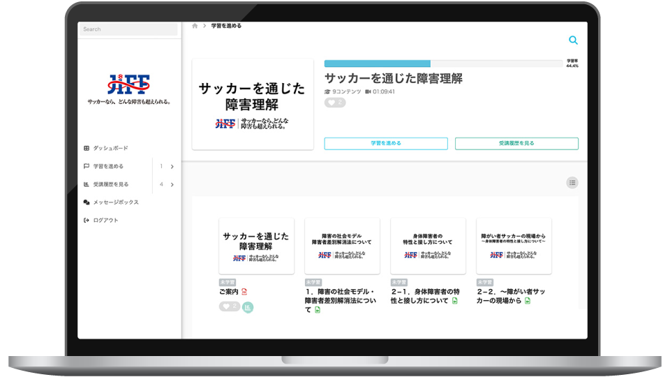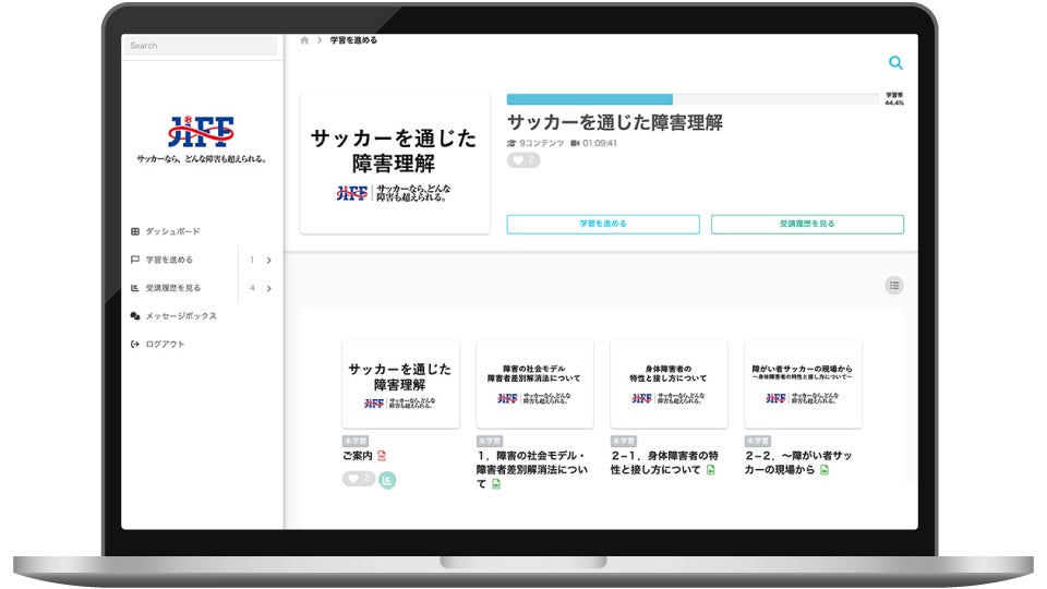 例えば、障がいのある人もない人もスポーツを通じて共に楽しめる社会を目指す一般社団法人日本障がい者サッカー連盟(JIFF)では、「learningBOX」を活用したオンライン学習の取り組みが進められています。eラーニングを通じて、多くの人が障がい者サッカーの理念や価値観を学び、理解を深めていく。そして、その学びが、互いを尊重し合える社会につながっていく。learningBOXは、こうした「人との関わり」への理解を広げる学びの場としても活用されています。
