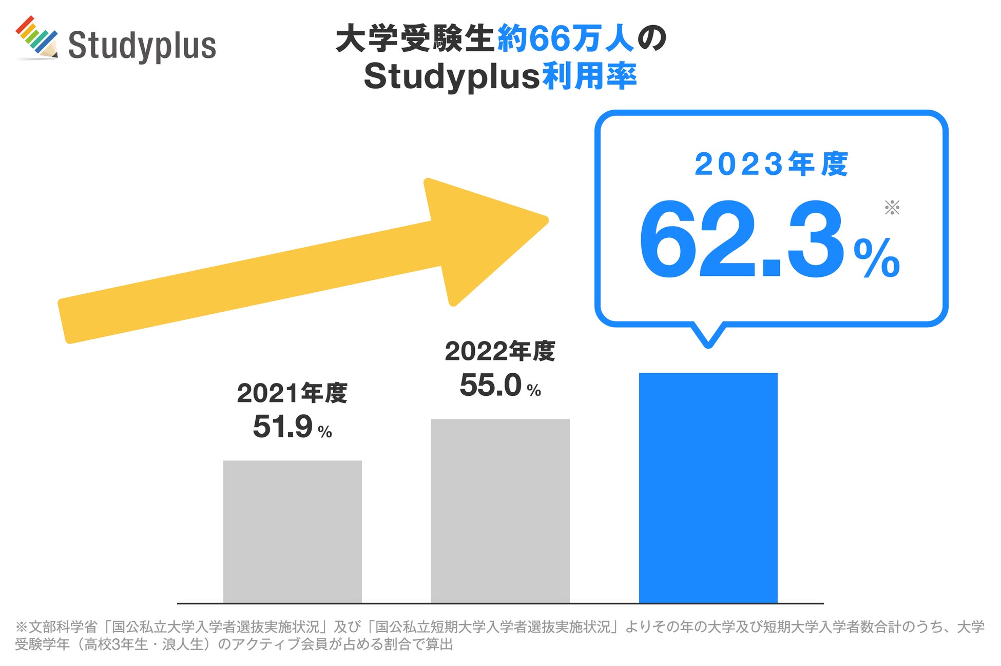大学受験生が「Studyplus」を利用する割合は2021年度に51.4%・2022年度に54.9%・2023年度に61.6%となっており、『大学受験生の2人に1人以上』が利用するアプリとなっております。 | 大学受験生が「Studyplus」を利用する割合は2021年度に51.9%・2022年度に55.0%・2023年度に62.3%となっており、『大学受験生の2人に1人以上』が利用するアプリとなっております。 |