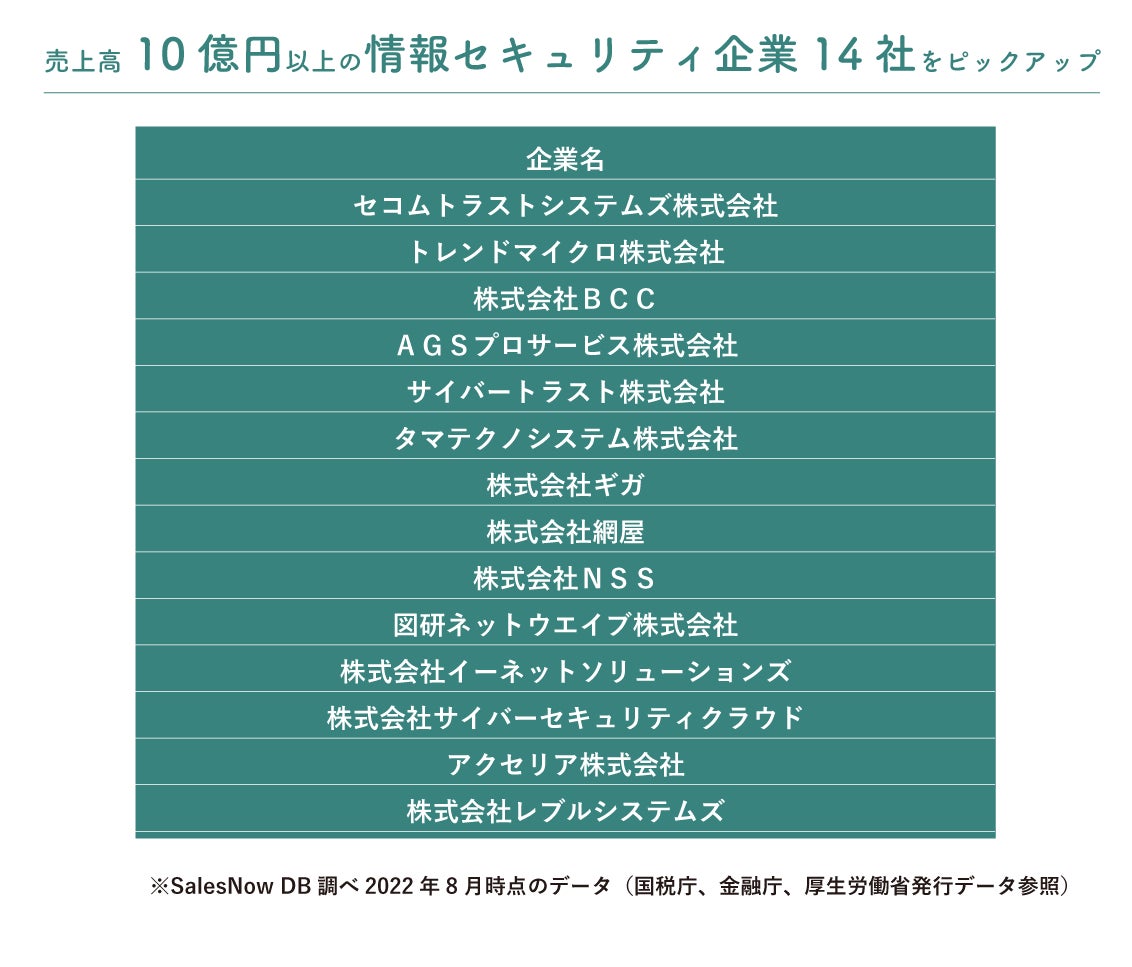 - 売上10億円以上の情報セキュリティ企業14社の中から企業をピックアップ