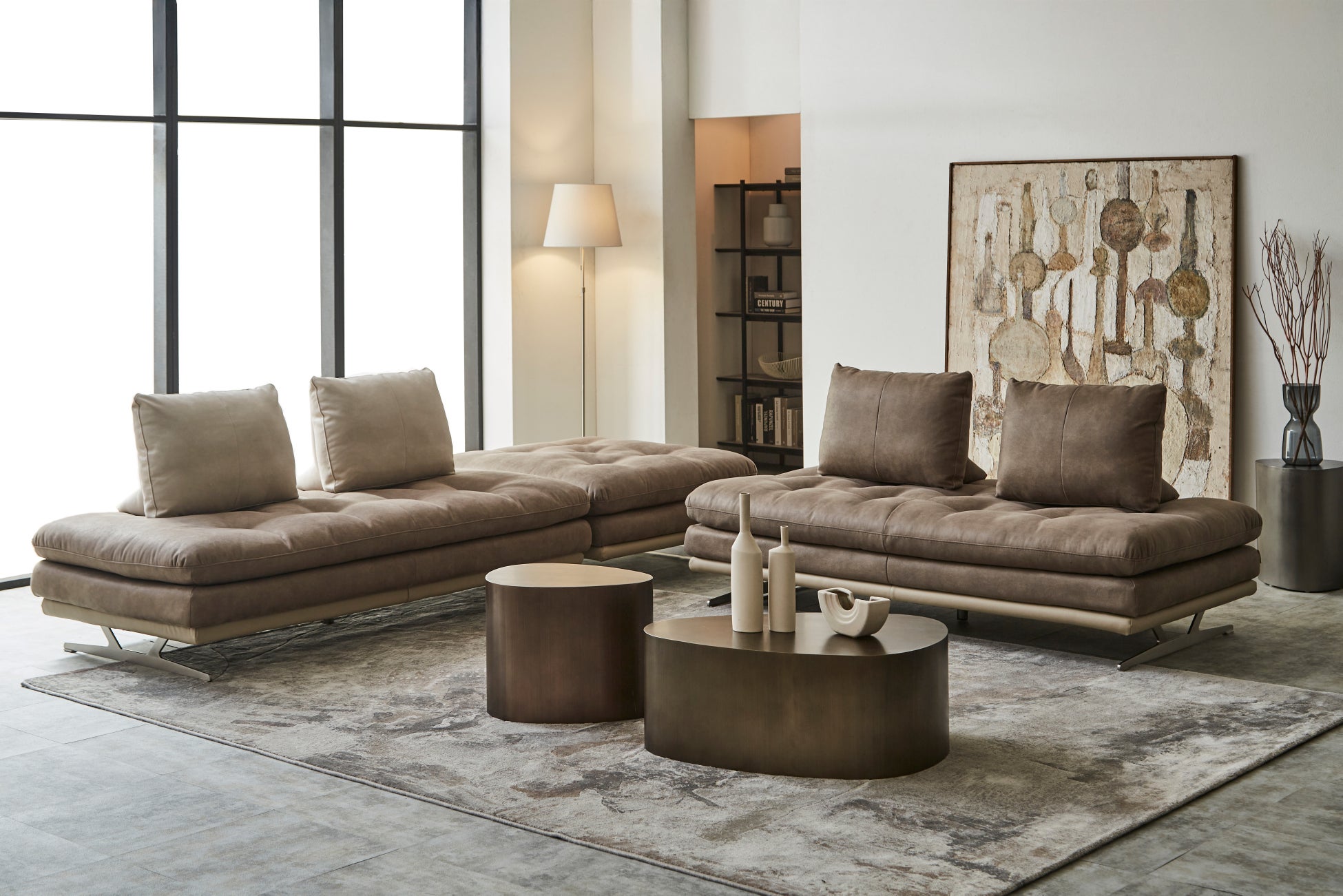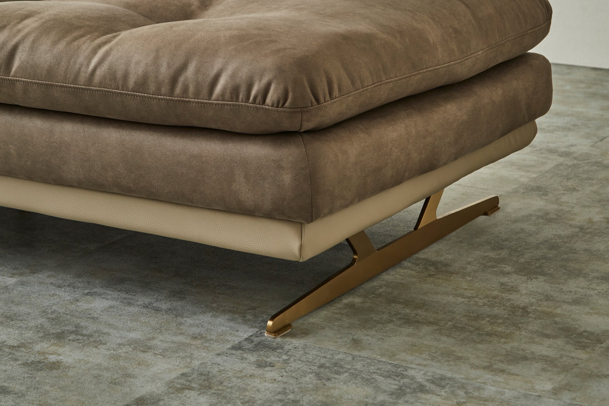 イタリアンモダンを取り入れた、自由度の高いラグジュアリーなアイランドソファです。デイベッドタイプのベースソファに、置き型の背クッションを自由に組み合わせることで、自在なレイアウトと寛ぎを実現します。ふわっとした柔らかな掛け心地に加え、イタリアンテイストのフォルムやディテールが上質な空間を演出してくれます。モダンなデザイン性と、自由で高い機能性を兼ね備えたハイセンスな一台。脚部は、ステンレスヘアラインとシャンパンゴールドの2種類の色から選べ、空間の雰囲気に合わせたコーディネートが可能です。