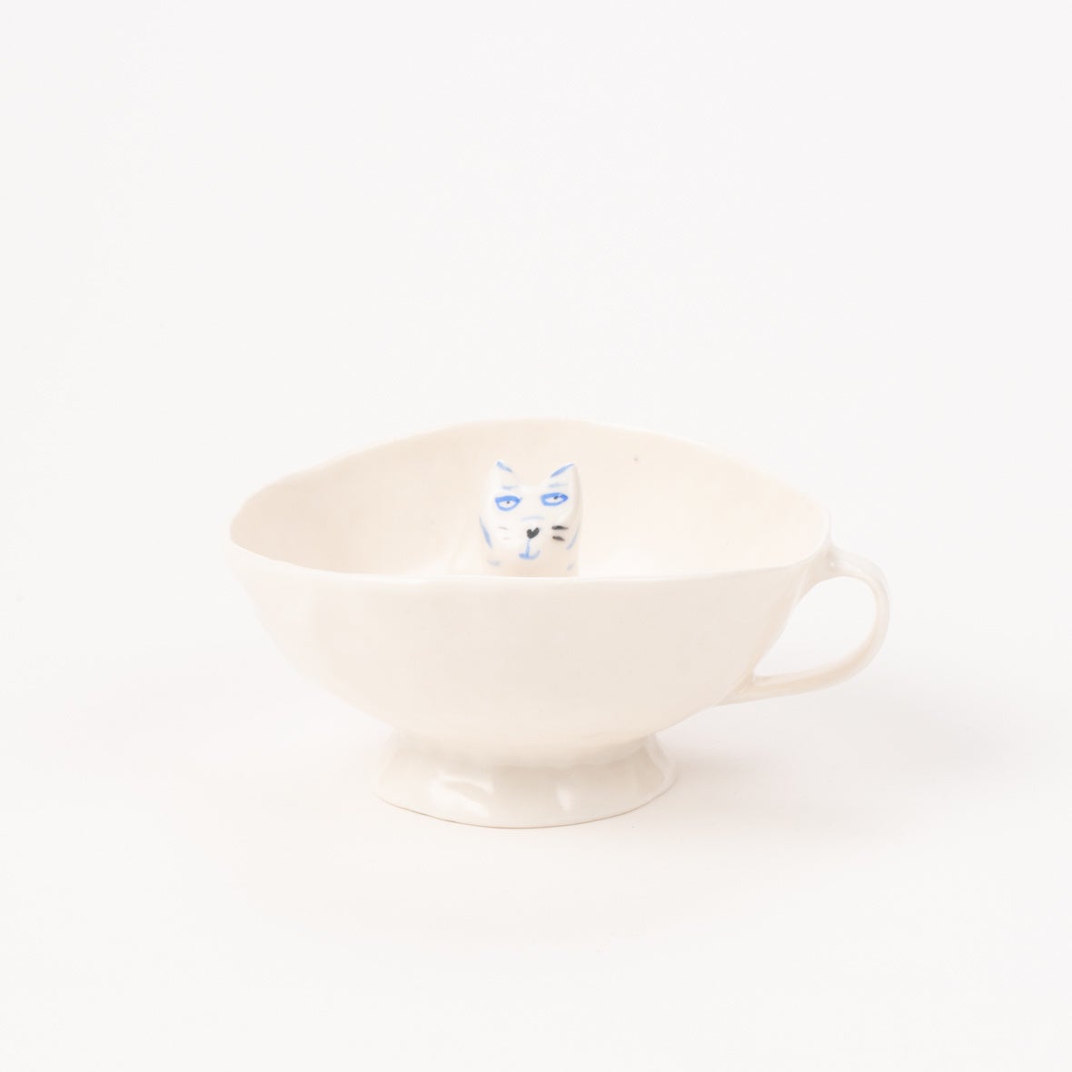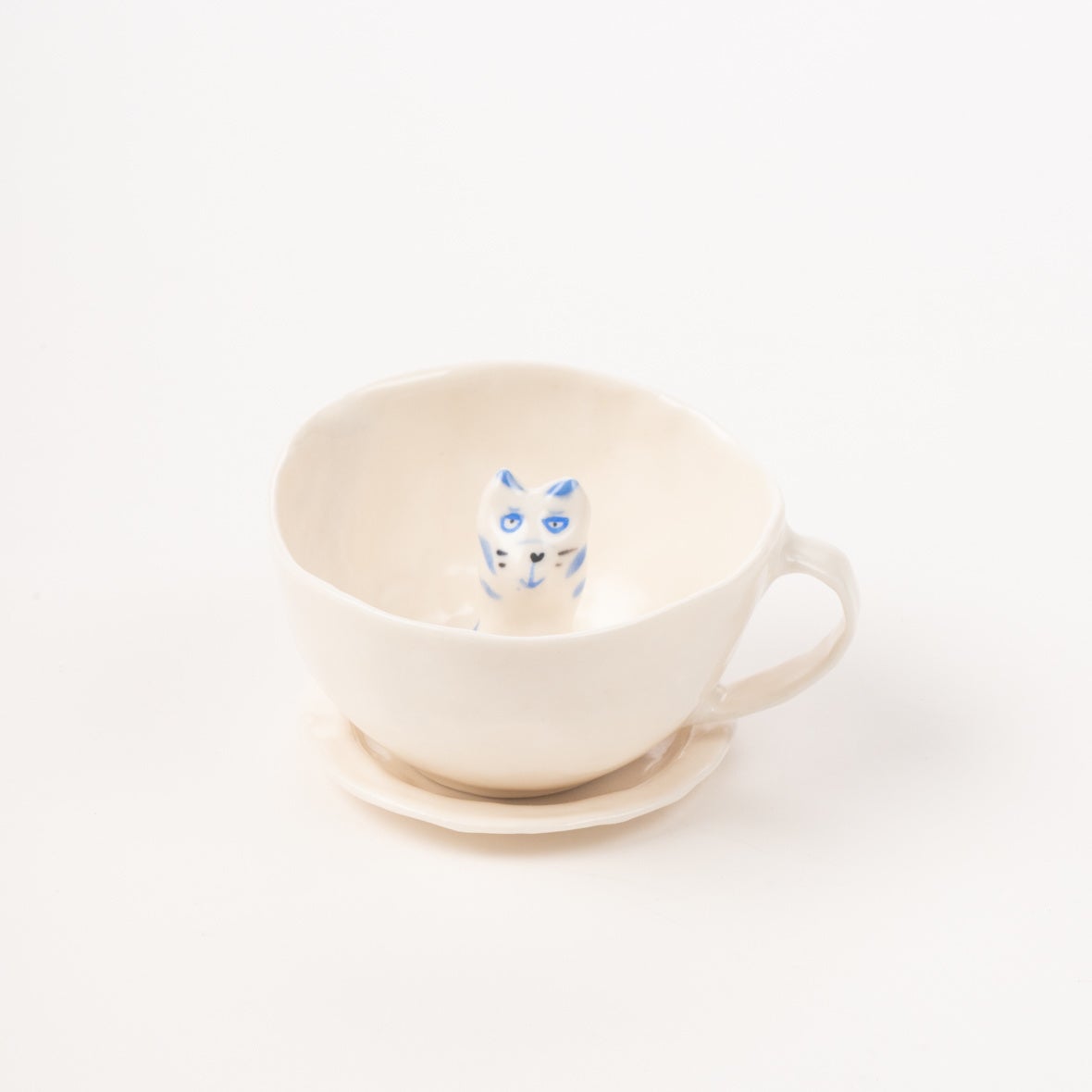 カップの底からネコがキュートに現れるこのカップは、イヌをテーマに作品を作り続ける彼女の代表作「しあわせのカップシリーズ」のネコバージョンとして、ネコ好きの皆さまの間で話題沸騰のアイテムなのです。