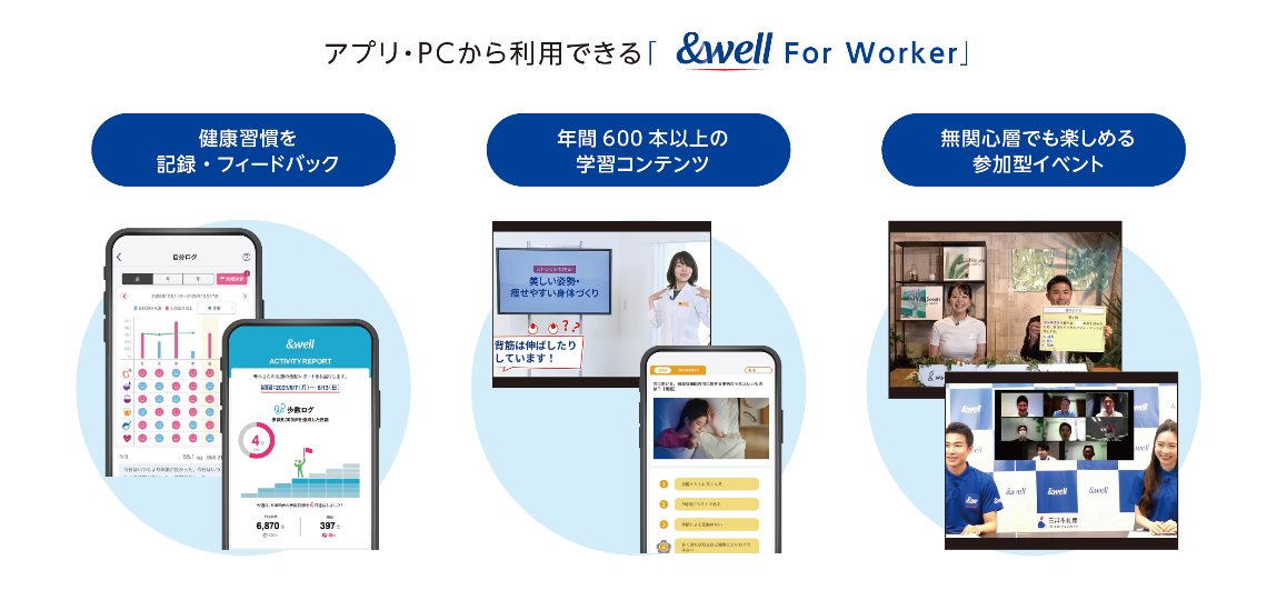 「&well」は、特定非営利活動法人健康経営研究会の監修のもと企業の健康経営を支援するサービスとして2019年に開始しました。従業員向けの「&well for Worker」と、企業の人事・健康担当者向けの「&well for HR」の2種類のサービスを提供し、企業の健康経営推進をサポートしています。