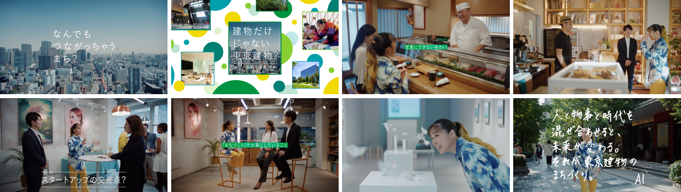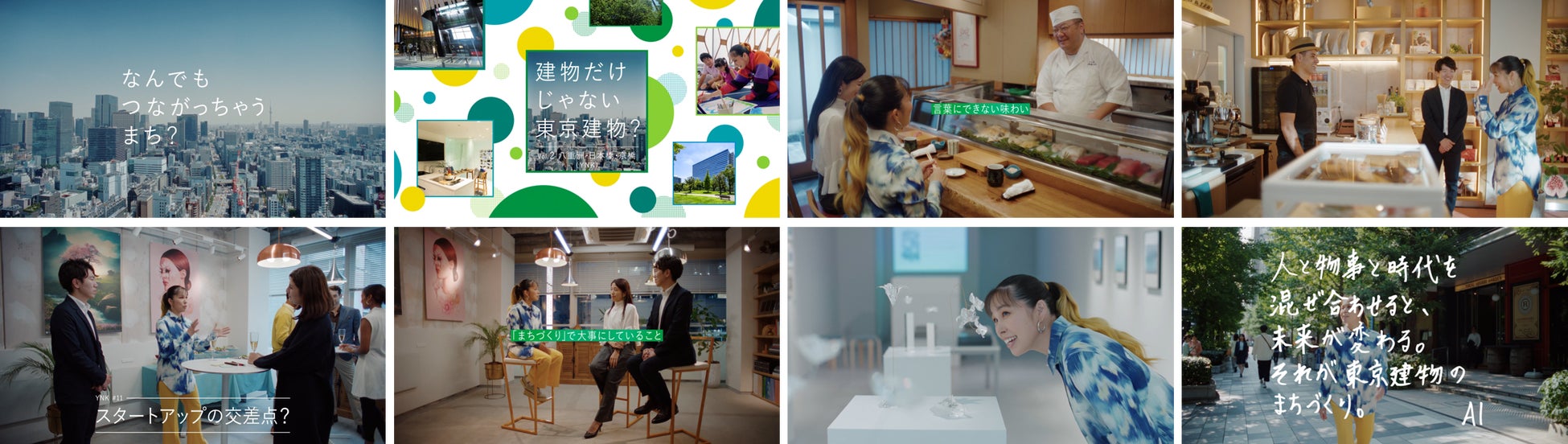 「建物だけじゃない東京建物?」というAIさんの掛け声でスタートする新CMは、サステナビリティパートナーのAIさんが、東京建物が携わるまちづくりの現場をめぐり、建物をつくるだけではない東京建物のまちづくりをリポートする内容となっています。「大手町の森」では「都心の本物の森」の魅力を、「八重洲・日本橋・京橋(YNK)」では「なんでもつながっちゃうまち」の縁(えにし)を、AIさんが実際に体験し、まちの人びととやりとりをする様子が、AIさんのリアルな反応(言葉)とともに映し出されています。