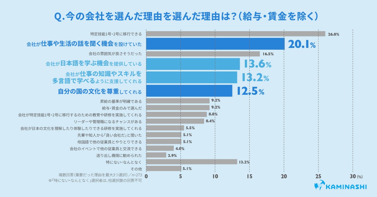 今の会社を選んだ理由(給与・賃金を除く)について質問したところ、1位は「特定技能1号・2号に移行できる」(26.0%)、2位は「会社が仕事や生活の話を聞く機会を設けていた」(20.1%)、3位は「会社の雰囲気が良さそうだった」(16.5%)、4位は「会社が日本語を学ぶ機会を提供している」(13.6%)、5位は「会社が仕事の知識やスキルを多言語で学べるように支援してくれる」(13.2%)、また僅差で6位が「自分の国の文化を尊重してくれる」(12.5%)という結果となりました。