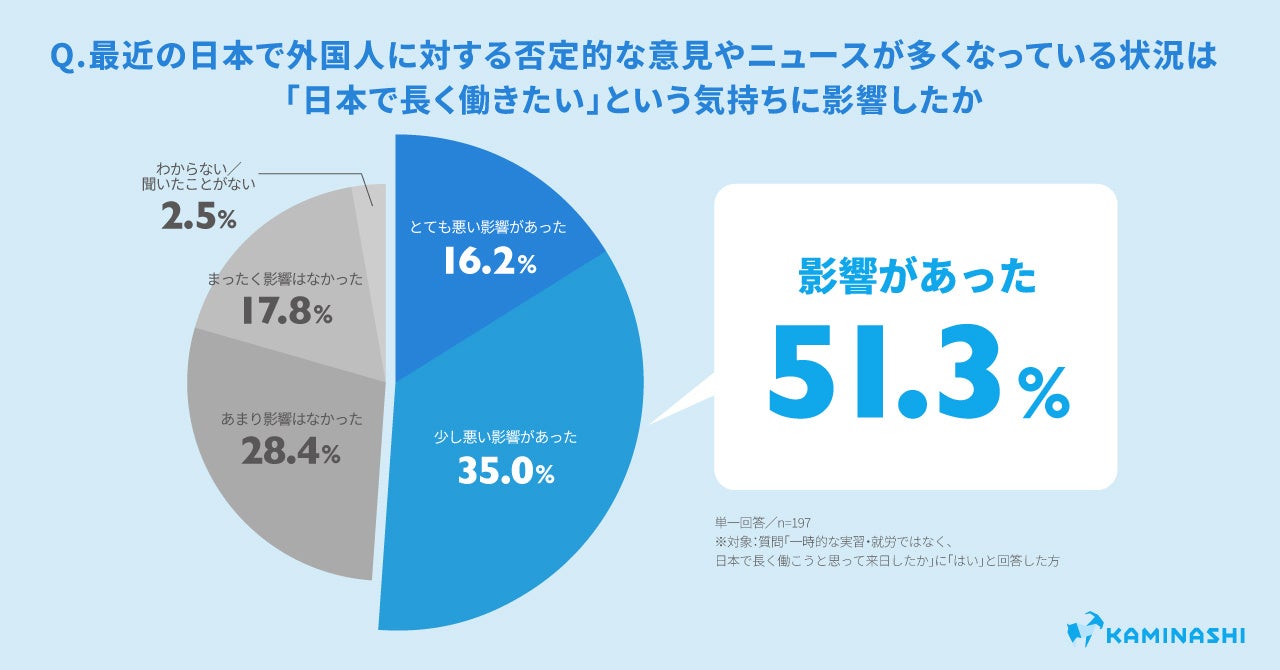 一時的ではなく、長期就労する前提で来日した外国人材は72.2%で、彼らに対し「最近日本での外国人に対する否定的な意見やニュースが多くなっている状況が『日本で長く働きたい』という気持ちに影響したか」を質問したところ、51.3%が「悪い影響があった」と回答しました。