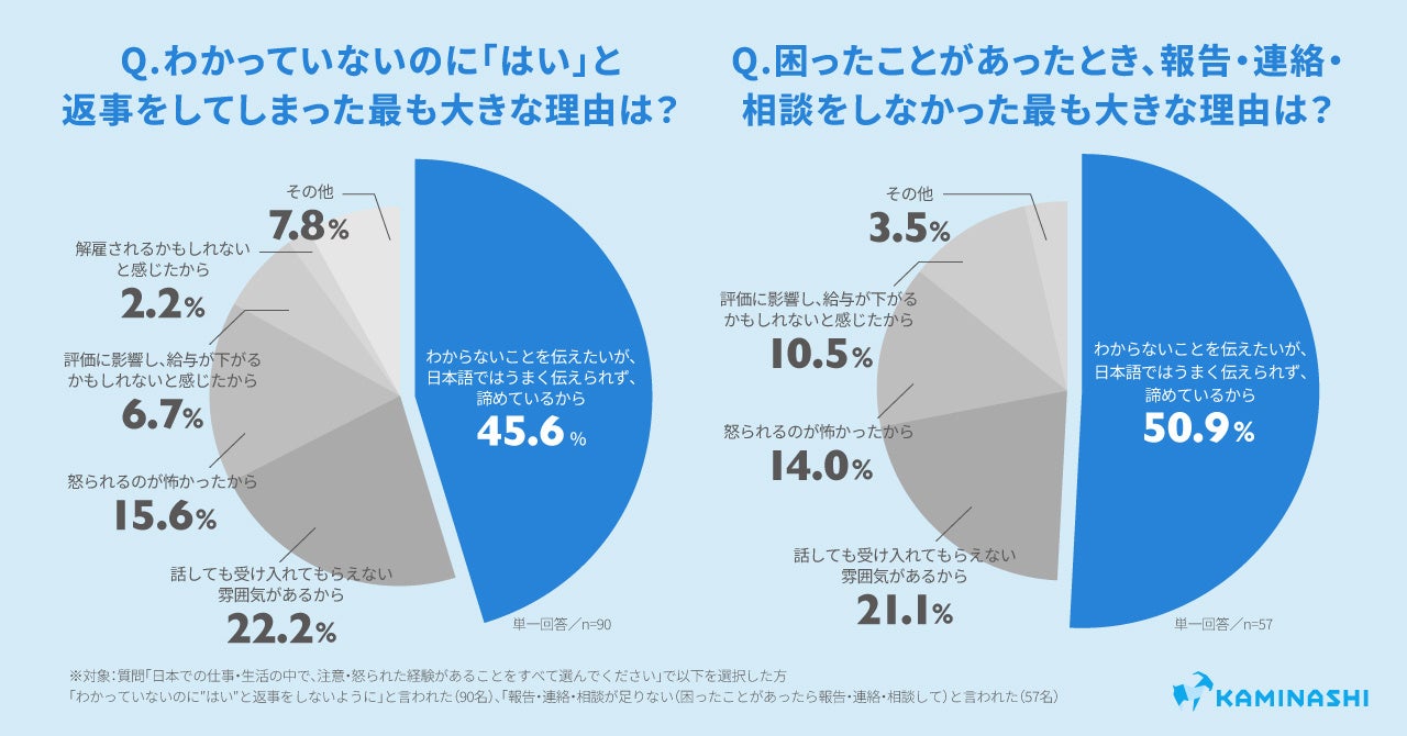 日本で仕事や生活をするなかで注意・怒られた経験がある人は57.9%と約6割。具体的な内容の上位は「『わかっていないのに"はい"と返事をしないように』と言われた」(57.0%)、「報告・連絡・相談が足りない(困ったことがあったら報告・連絡・相談して)」と言われた(36.1%)という結果でした。さらに「わかっていないのに“はい”と返事をしてしまった」「困ったことがあったとき、報告・連絡・相談をしなかった」理由として最も大きいものを複数選択肢の中から1つ回答してもらった結果、最も多かったのは共に「わからないことを伝えたいが、日本語ではうまく伝えられず諦めているから」(45.6% / 50.9%)でした。