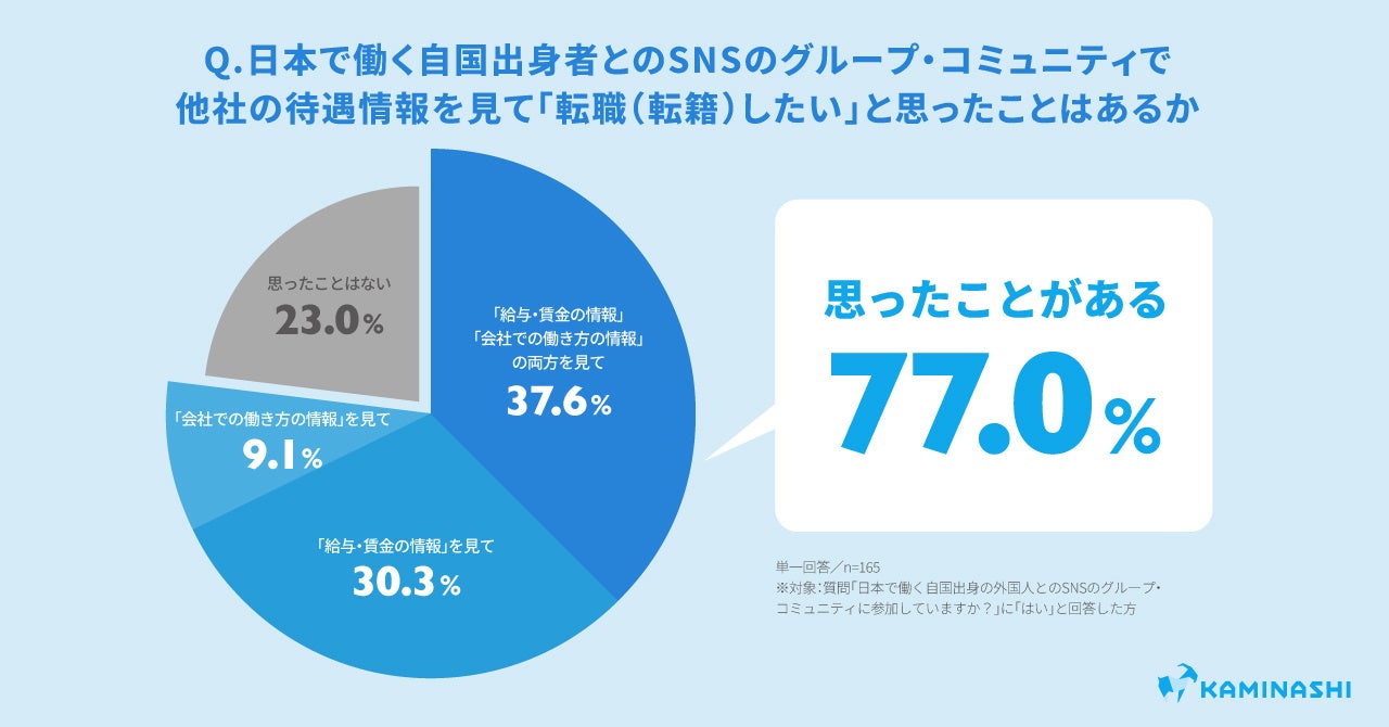日本で働く自国出身の外国人とのSNSのグループ・コミュニティに参加しているか質問したところ、60.4%が参加していることが明らかになりました。またそのうち、そのコミュニティで他社の給与もしくは働き方に関する情報を見て転職したいと思ったことがある回答者は合計77.0%にも上り、「両方を見て、そう思ったことがある」(37.6%)が最も多く、次いで「『給与・賃金の情報』を見て、そう思ったことがある」(30.3%)、「『会社での働き方の情報』を見て、そう思ったことがある」(9.1%)となりました。