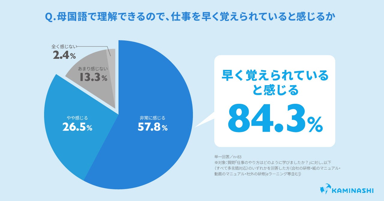約6割が業務をOJTで学ぶも、うち半数が聞き直しを躊躇。また母国語に対応した手段で業務を習得した層の8割は「母国語だからこそ早く習得できた」と回答