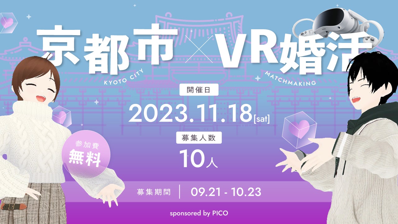 この度、応援団の登録企業である株式会社Flamers(東京都世田谷区)及び同社提携企業であるPICO Technology Japan株式会社との三者連携により、京都市への移住・定住促進及び独身男女への人生を共に歩むパートナーとのつながりを築くきっかけとなる出会いと交流の場の提供を目的に、京都市として初となる、メタバース空間を活用したVR婚活イベントを11月18日(土)に実施するため、本日から参加者の募集を開始しますのでお知らせします。