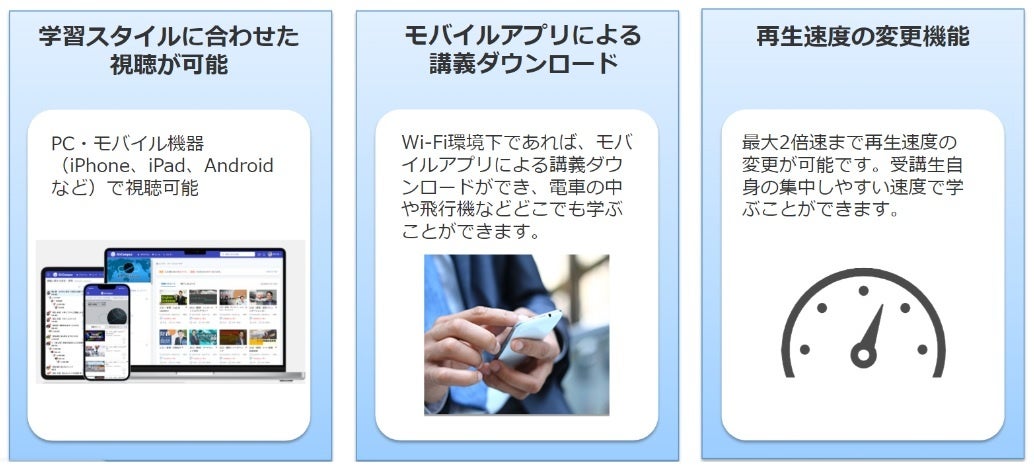 ④パソコンやモバイルアプリを使用し、場所や時間に制約されない柔軟な学習環境を提供