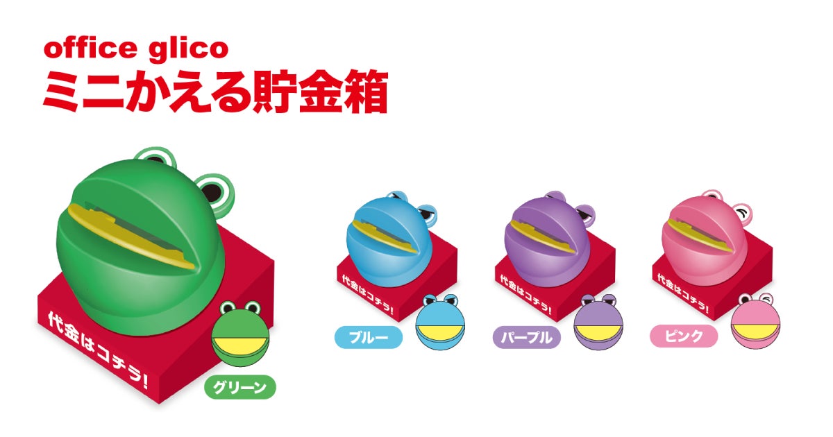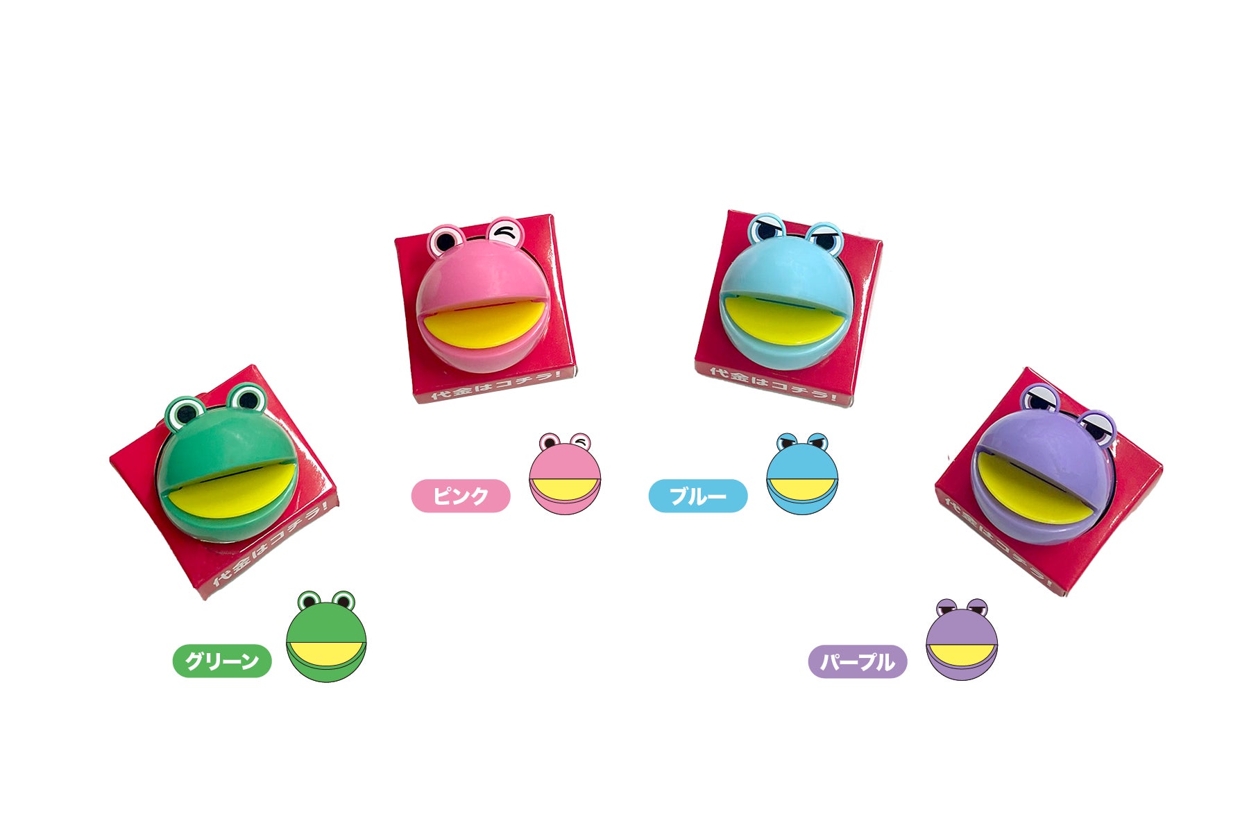 オフィスグリコの「かえるの貯金箱」デザインのミニコインケース。表情が違うグリーン、ブルー、パープル、ピンクの全4種類。