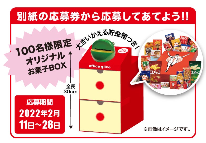 「office glico ミニかえる貯金箱」かぷえぼ限定カプセルトイに同封の応募券で期間中応募していただいた方の中から、抽選で100名さまに、オフィスグリコの「かえるの貯金箱」デザインの「大きいかえる貯金箱つき限定オリジナルお菓子BOX」をプレゼントいたします。詳細は「office glico ミニかえる貯金箱」かぷえぼ限定カプセルトイに同封の応募券をご確認ください。