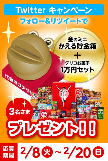 - 「金のミニかえる貯金箱+江崎グリコお菓子1万円分」が当たるTwitterキャンペーンを開催