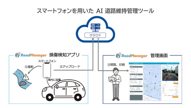 「RoadManager損傷検知」は、スマートフォンを車に載せて走らせるだけで、画像から損傷を自動検知。