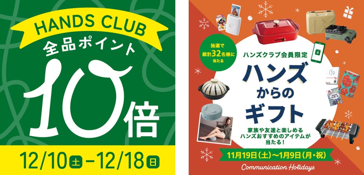12月10日(土)から12月18日(日)までは「ハンズまるごと!ハンズクラブ 全品ポイント10倍!」キャンペーンを店舗・ネットストアにて同時開催いたします。