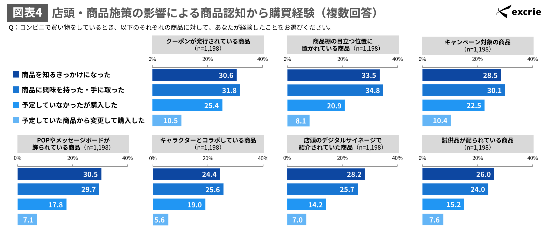 店頭・商品施策の影響による商品認知から購買経験(複数回答)